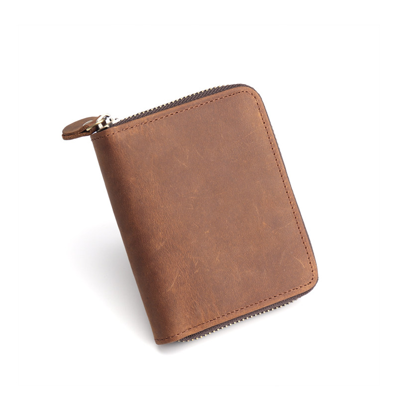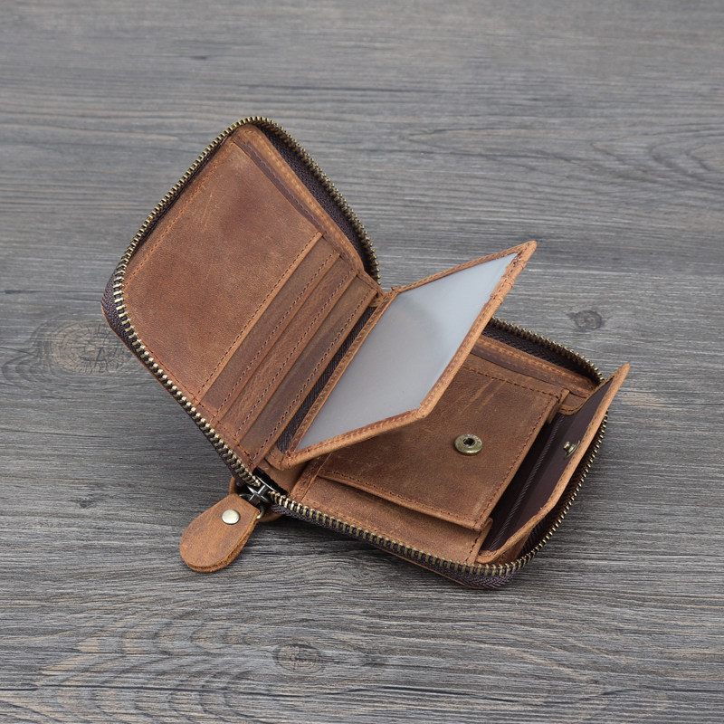 疯马皮拉链短钱包头层牛皮多功能钱夹手工真皮男士复古竖款零钱包