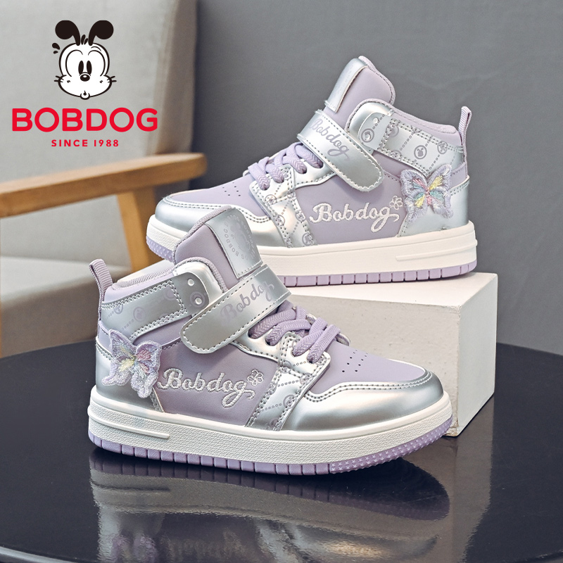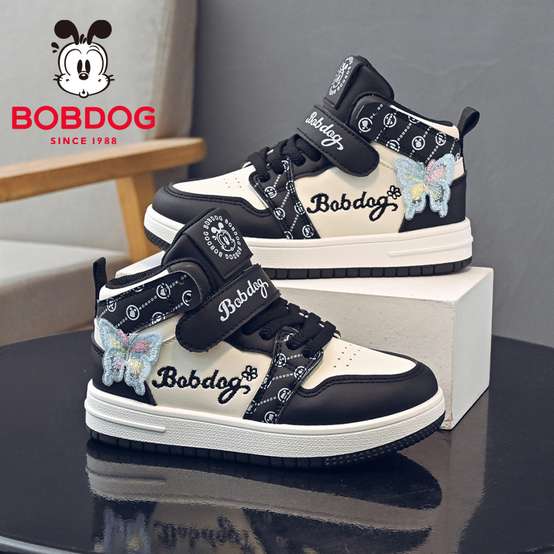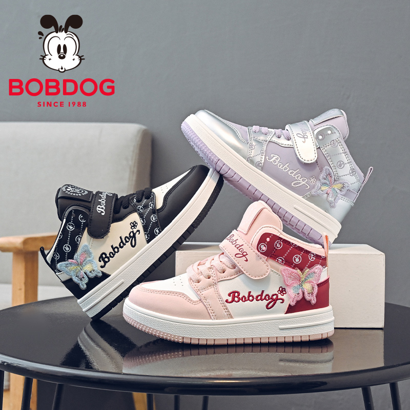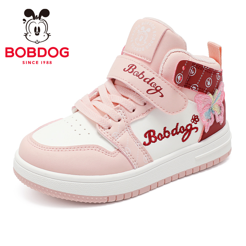 巴布豆童鞋女童高帮板鞋2025春秋新款皮面防水儿童鞋子女孩运动鞋