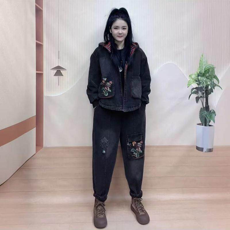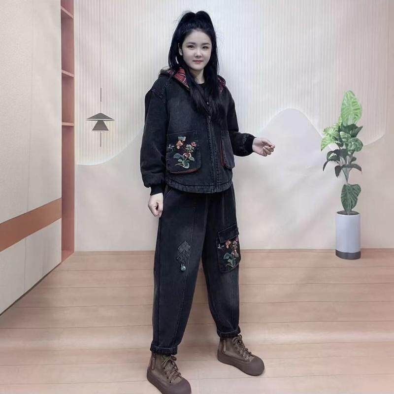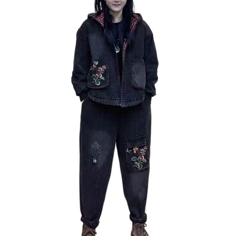 冬季新款加棉休闲牛仔拉链外套套装复古连帽显瘦加绒老爹裤两件套