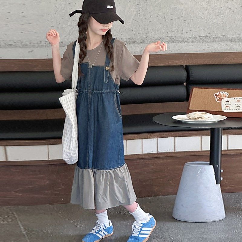 拼接假两件牛仔连衣裙女童夏季2025新款收M腰显瘦气质中长款背带