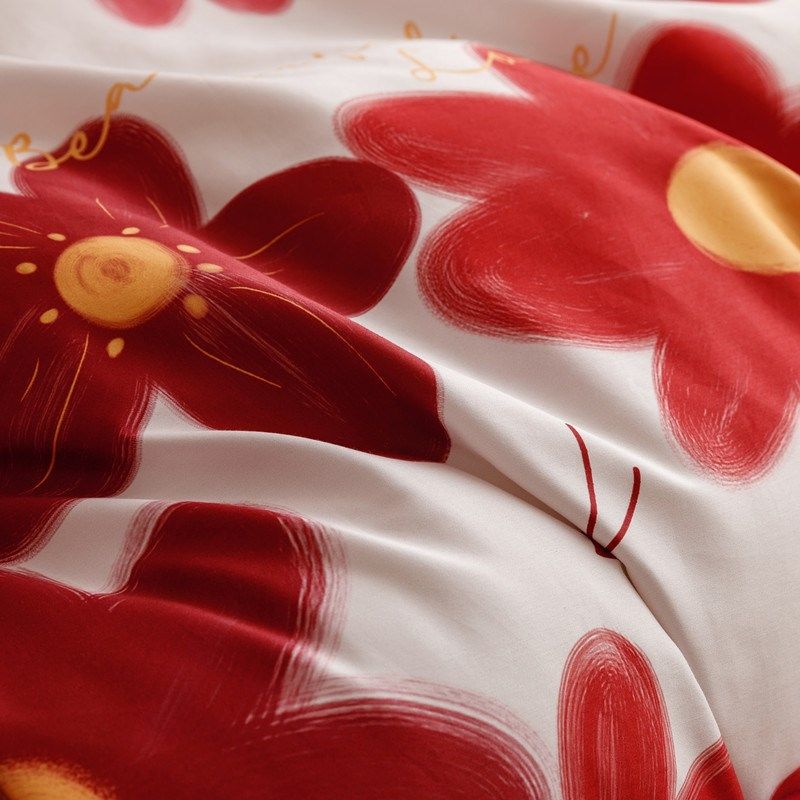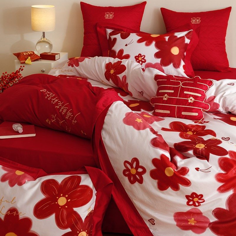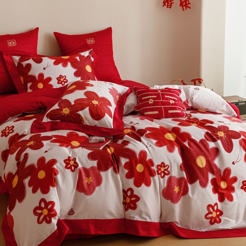 田园小清新结婚100支新疆长绒棉婚庆床上用品四件套红色床单4