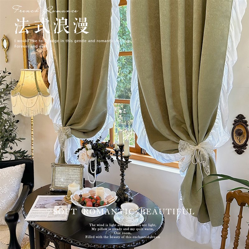 法式复古绿浪漫蕾丝花边遮光飘窗窗帘阳台隔断小窗装饰半帘门布帘