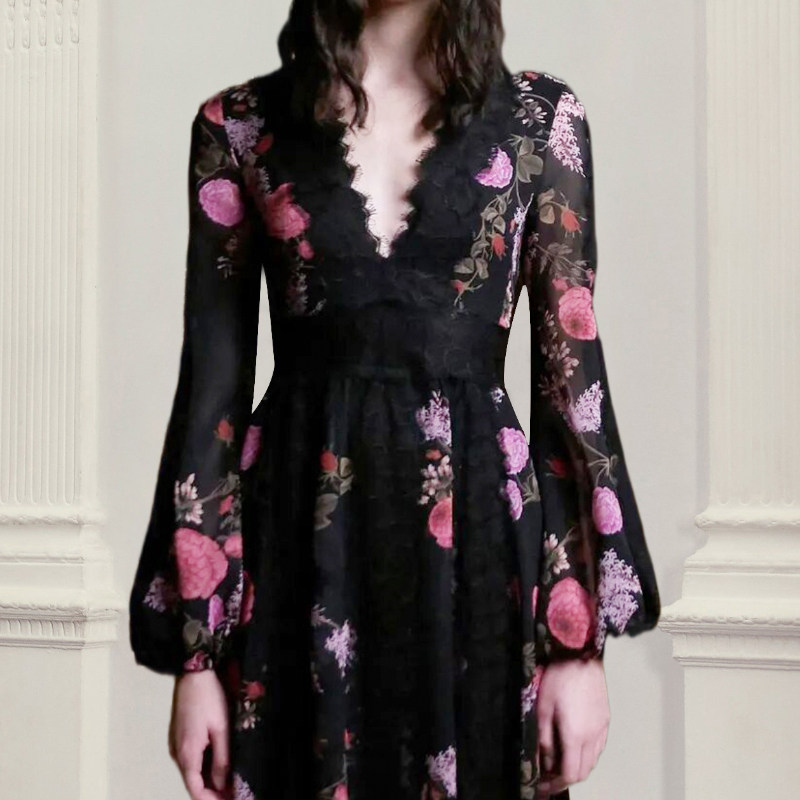 法式轻奢黑色碎花连衣裙女V领蕾丝长裙气质裙子长袖印花春秋女装