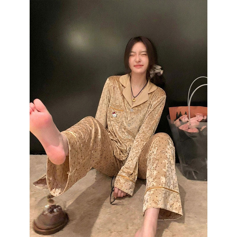 韩系卡通猫金丝绒休闲睡衣女2026春季大码加厚波点家居服大码套装