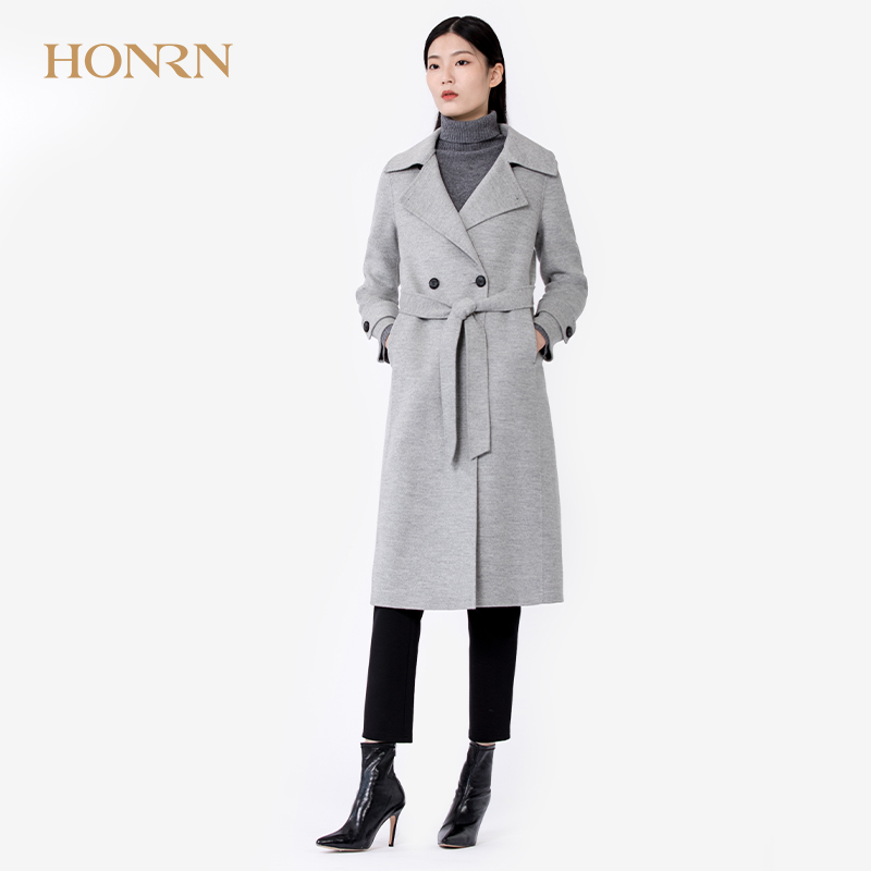 HONRN/红人双面羊毛呢子纽扣大衣女秋冬中长款系带收腰外套显瘦