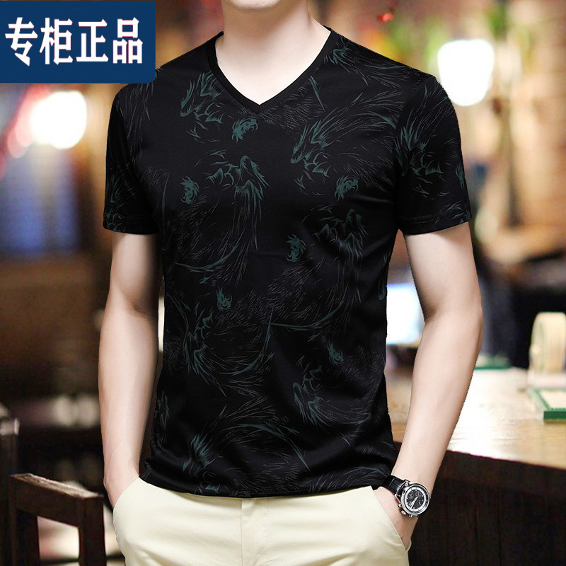 夏季冰丝光棉V领短袖t恤男装中年鸡心领宽松大码半袖爸爸装体恤衫