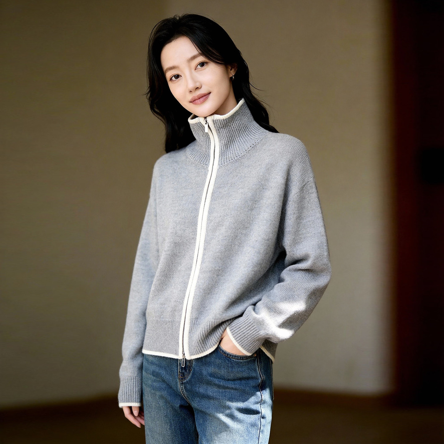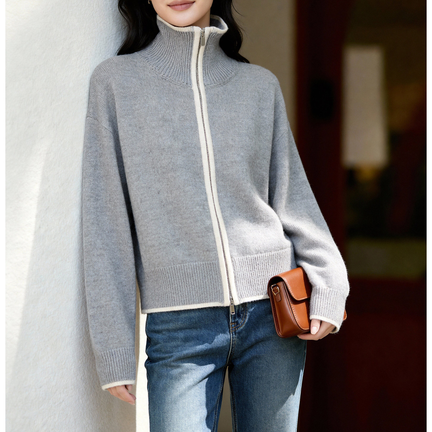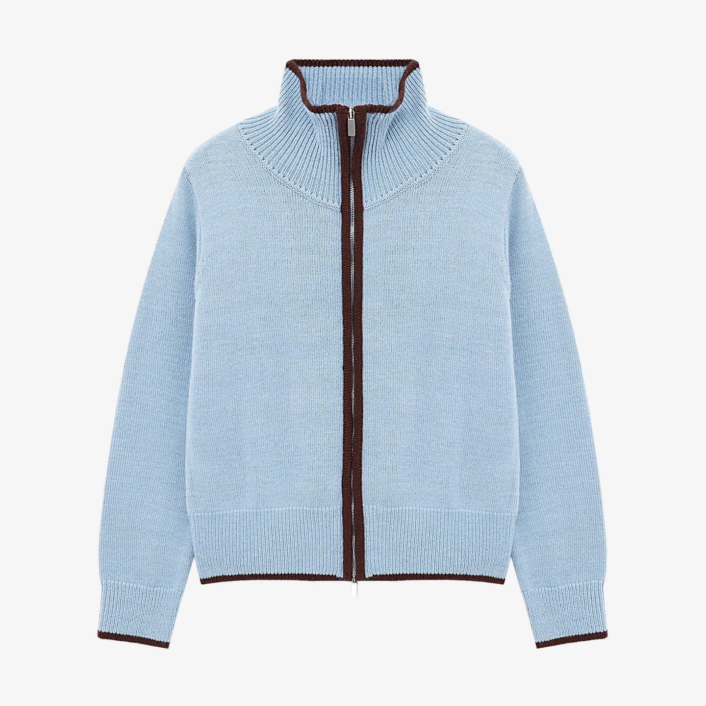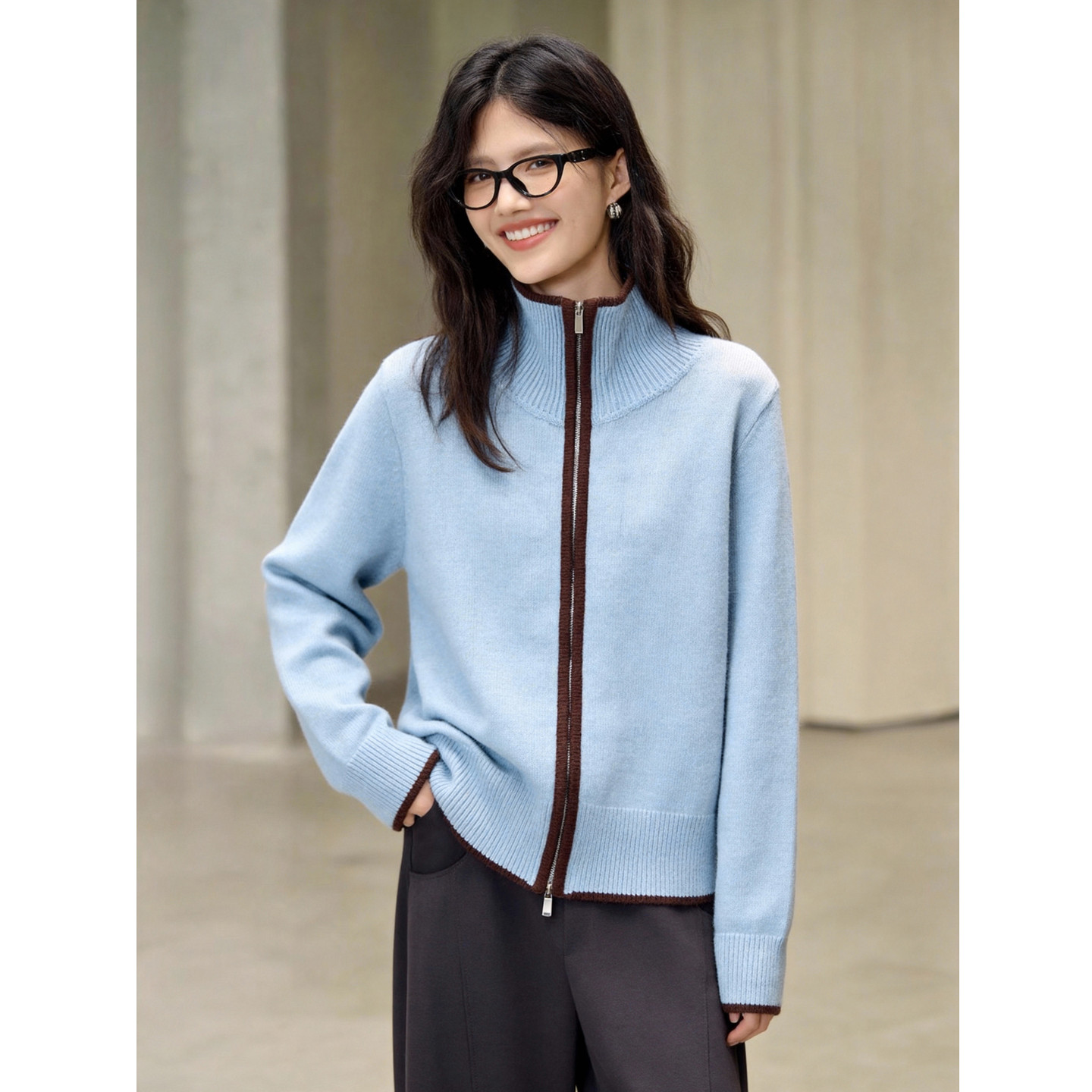 Basic House/百家好浅蓝撞色立领拉链针织开衫女春季宽松毛衣外套