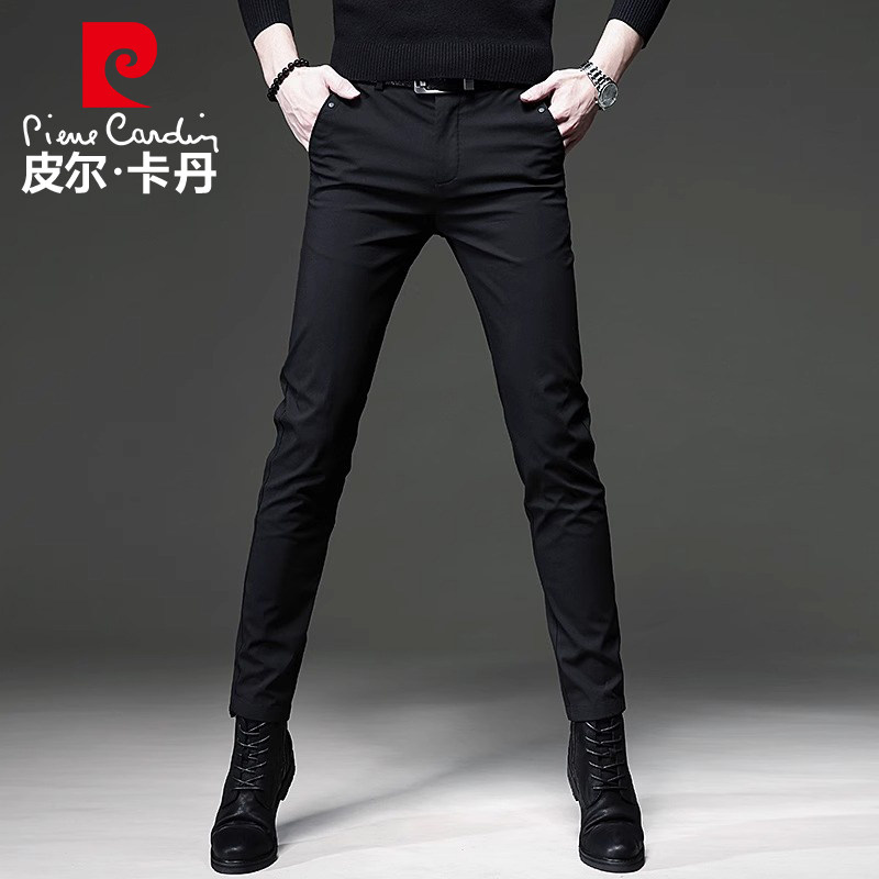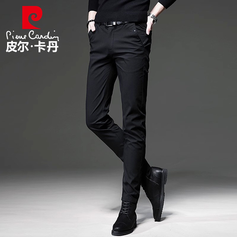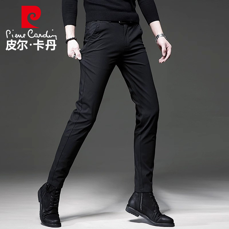 皮尔卡丹男士休闲裤秋冬加绒加厚西裤修身弹力轻商务黑色小脚长裤