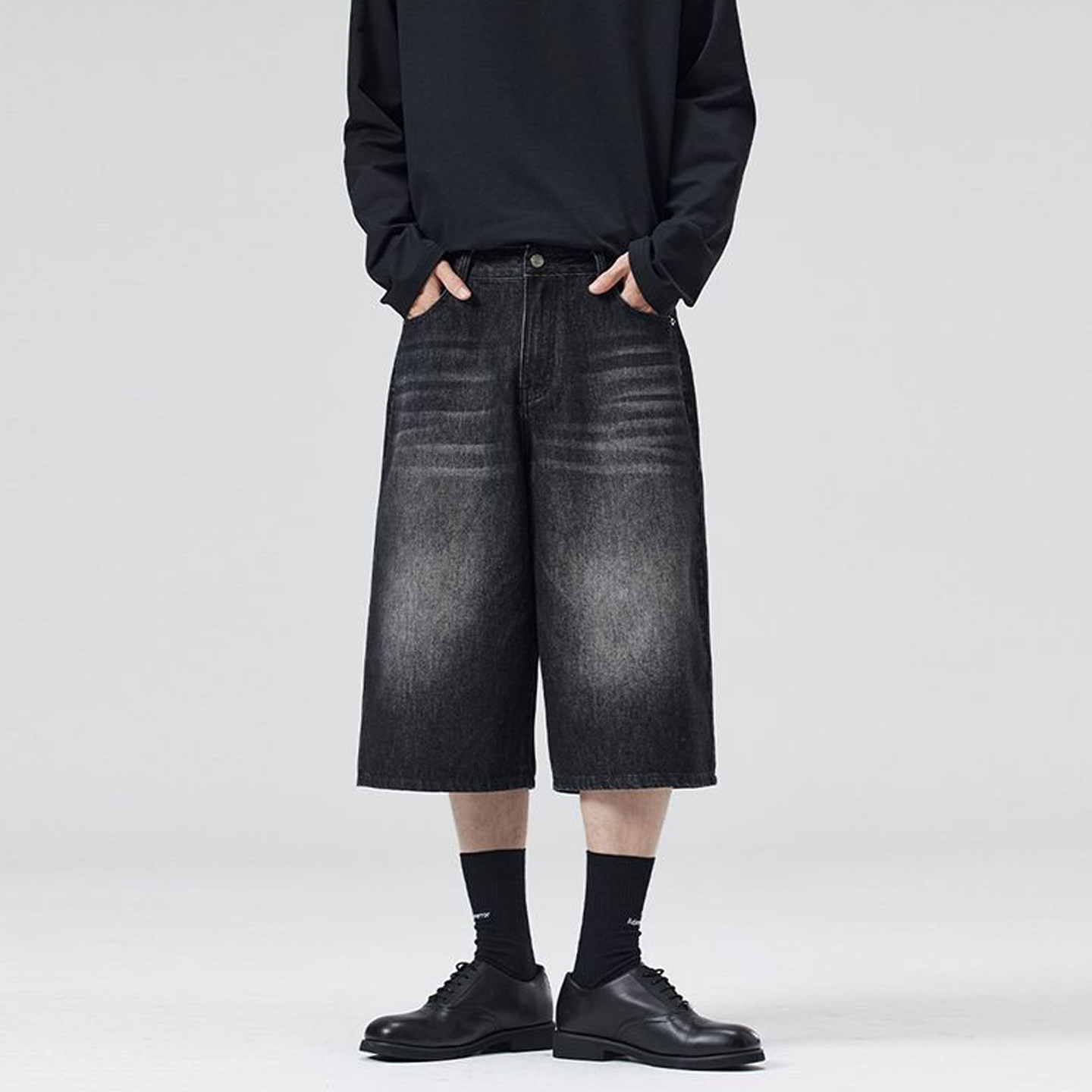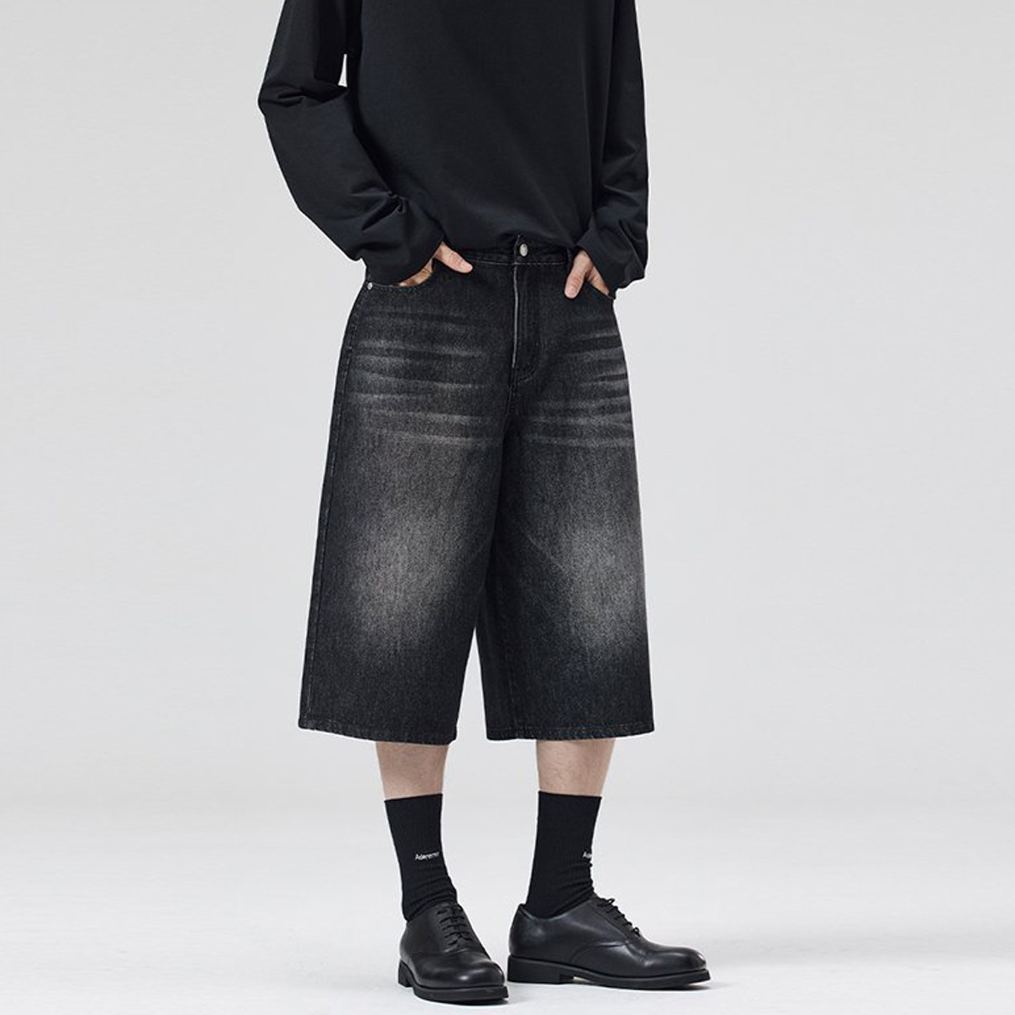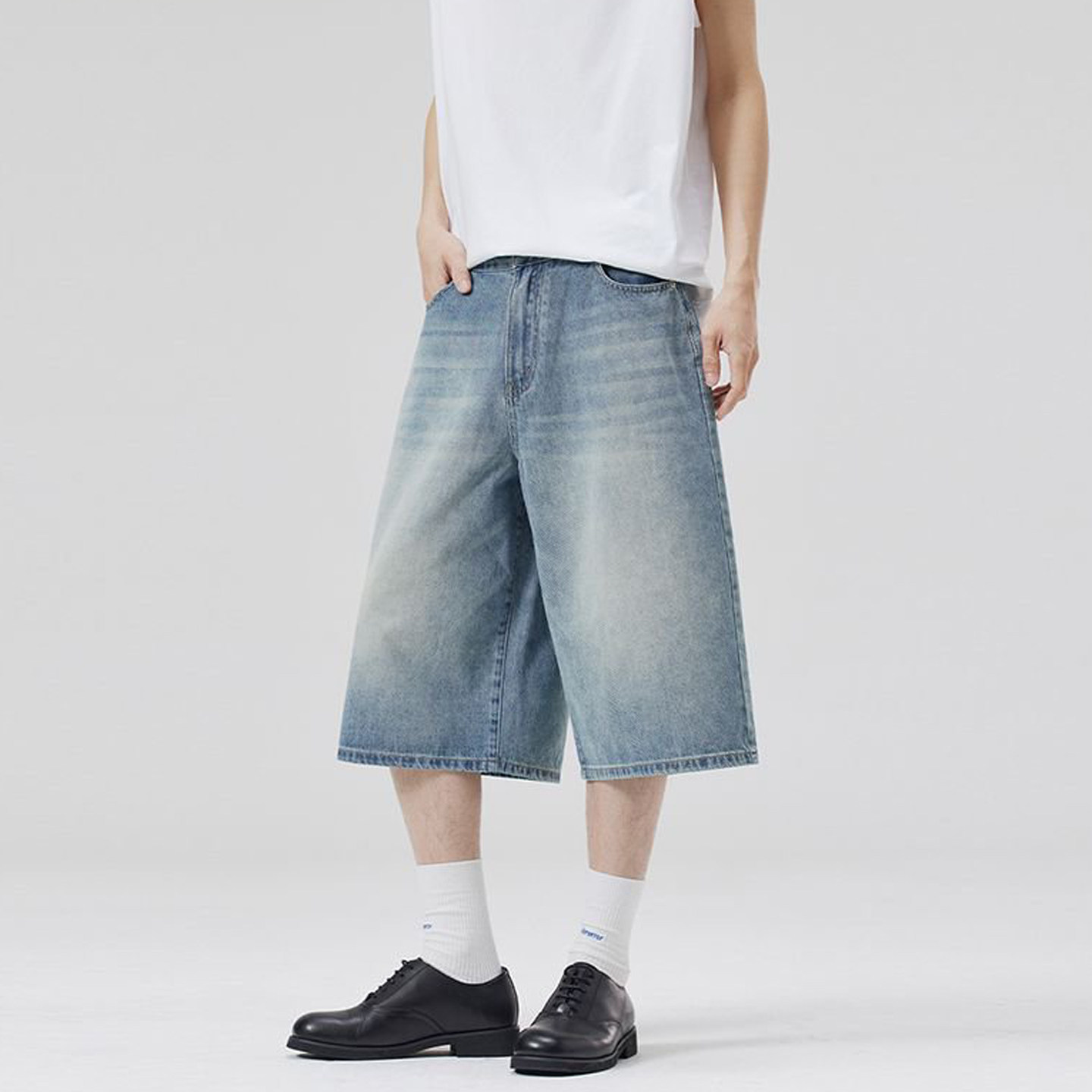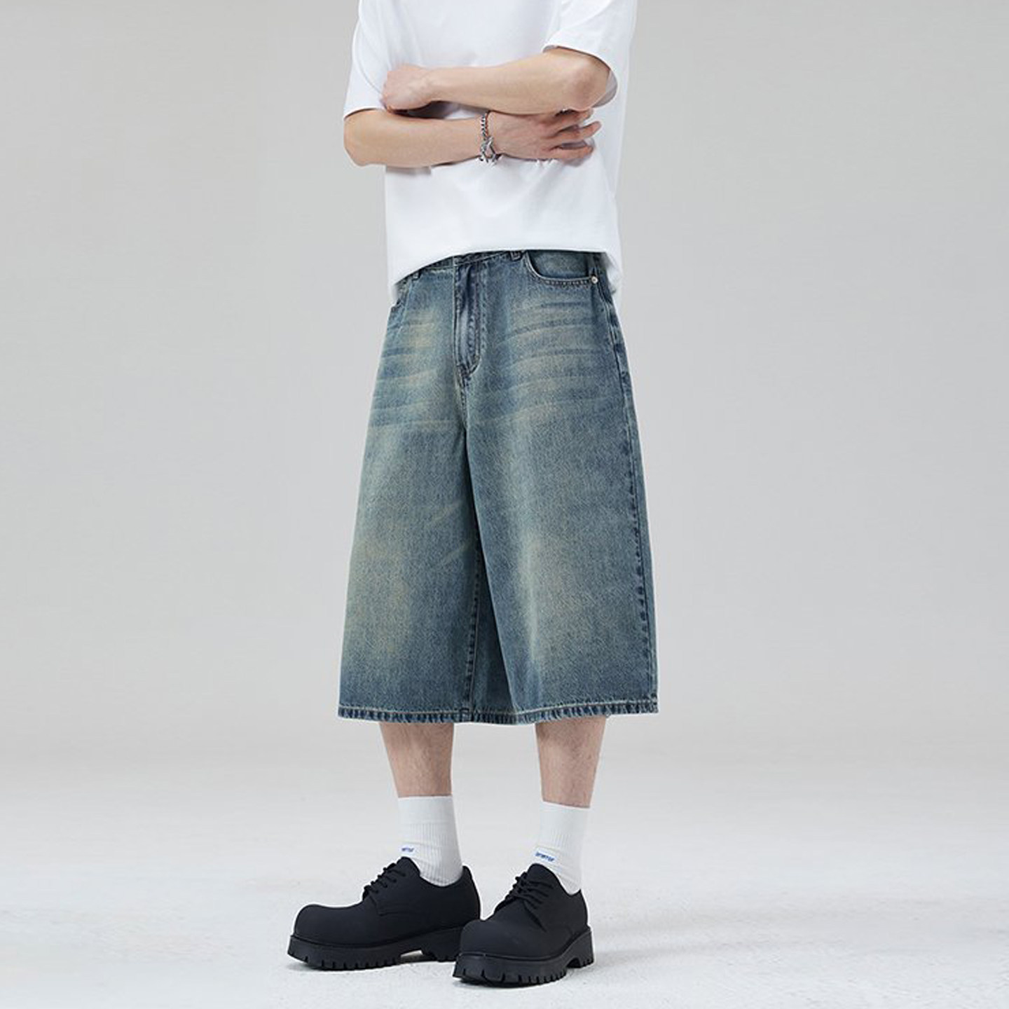深蓝色水洗做旧牛仔裤男夏季新款高腰直筒七分裤宽松显瘦阔腿中裤