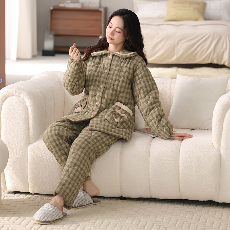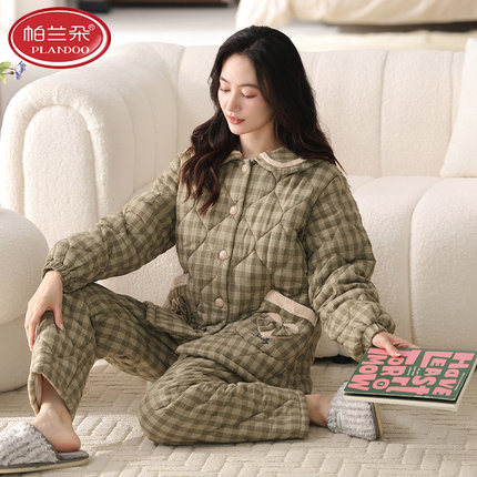 帕兰朵梭织纯棉夹棉睡衣女冬款三层加厚女士保暖家居服秋冬款套装
