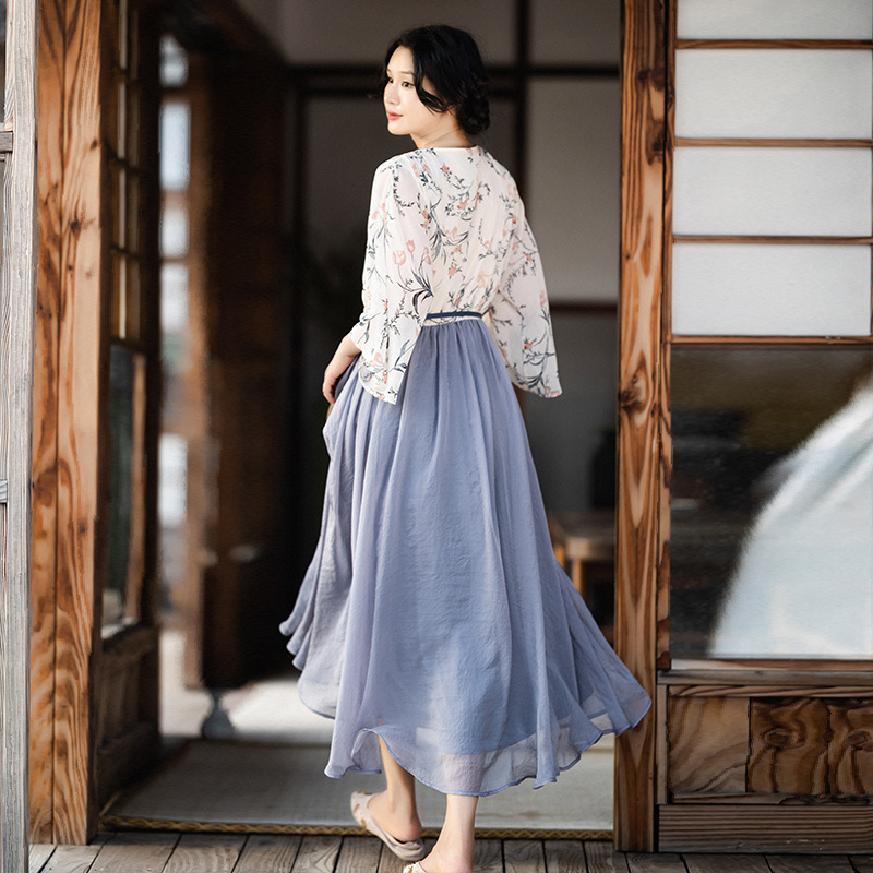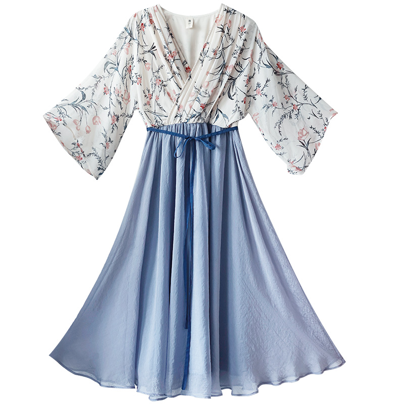 现货【黛画生花】复古国风v领连衣裙女夏季雪纺印花拼接大摆长裙
