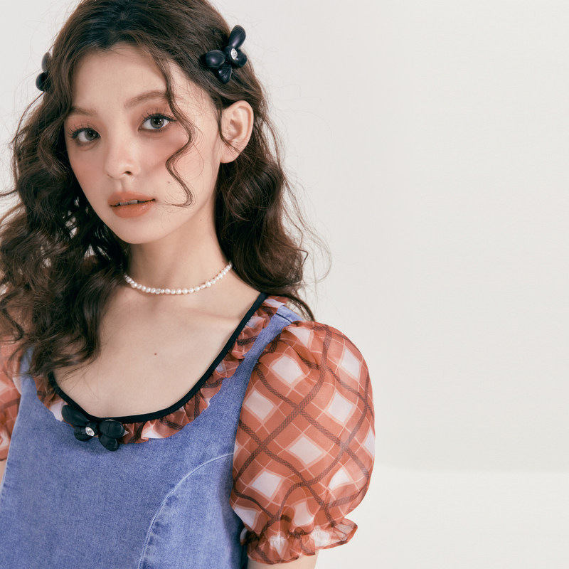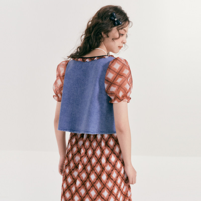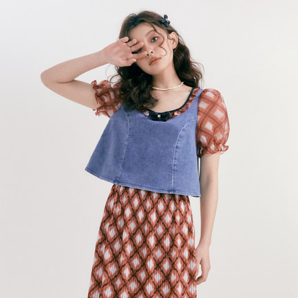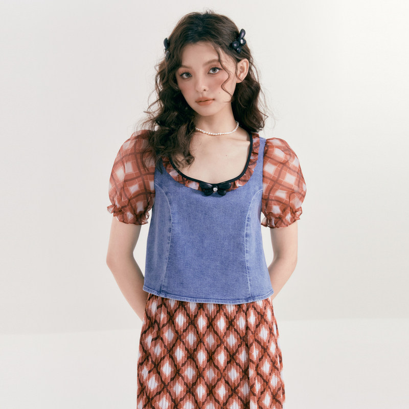 【断码清仓】乐町甜美拼接宽松上衣格纹方领牛仔纱雪纺衫少女鬼马
