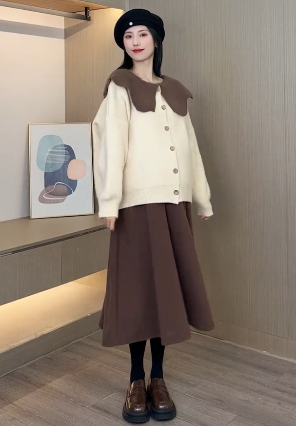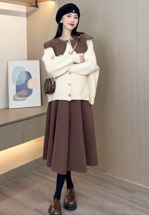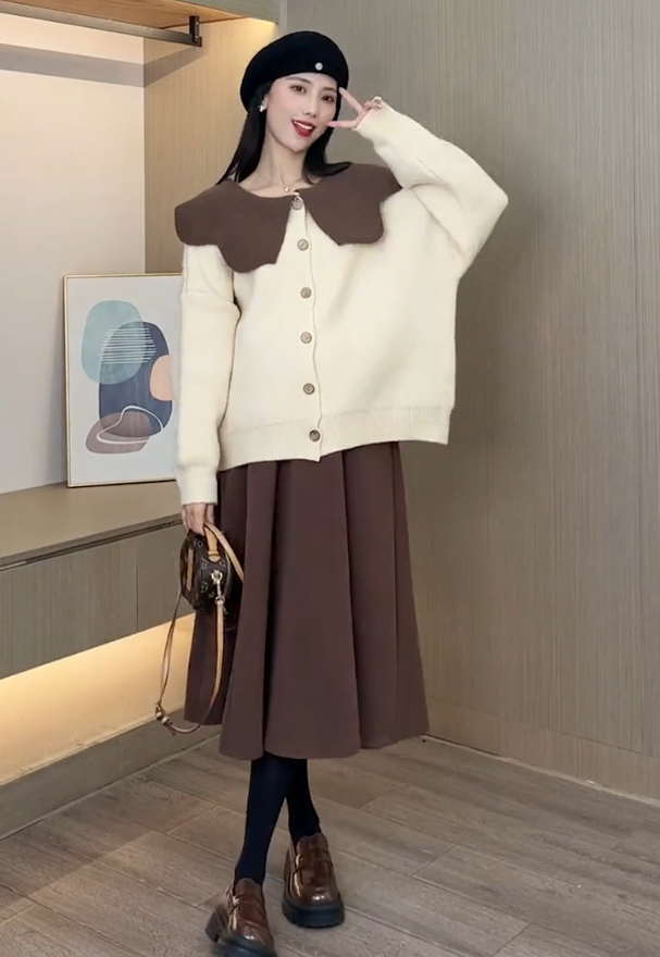 孕妇秋冬套装长袖娃娃领毛衣托腹中长款半身裙2024新款时尚百搭女