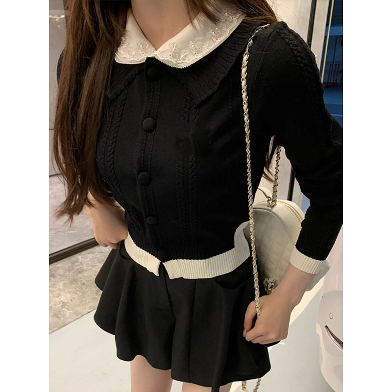 法式小香风撞色翻领假两件毛衣开衫女秋冬季慵懒风娃娃领针织外套