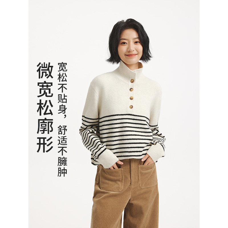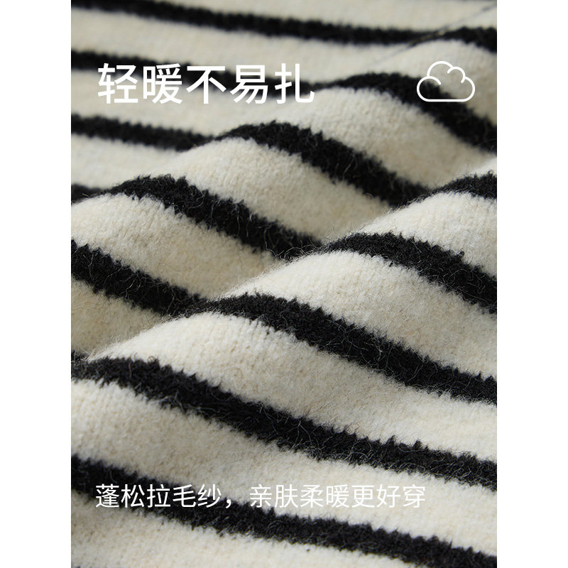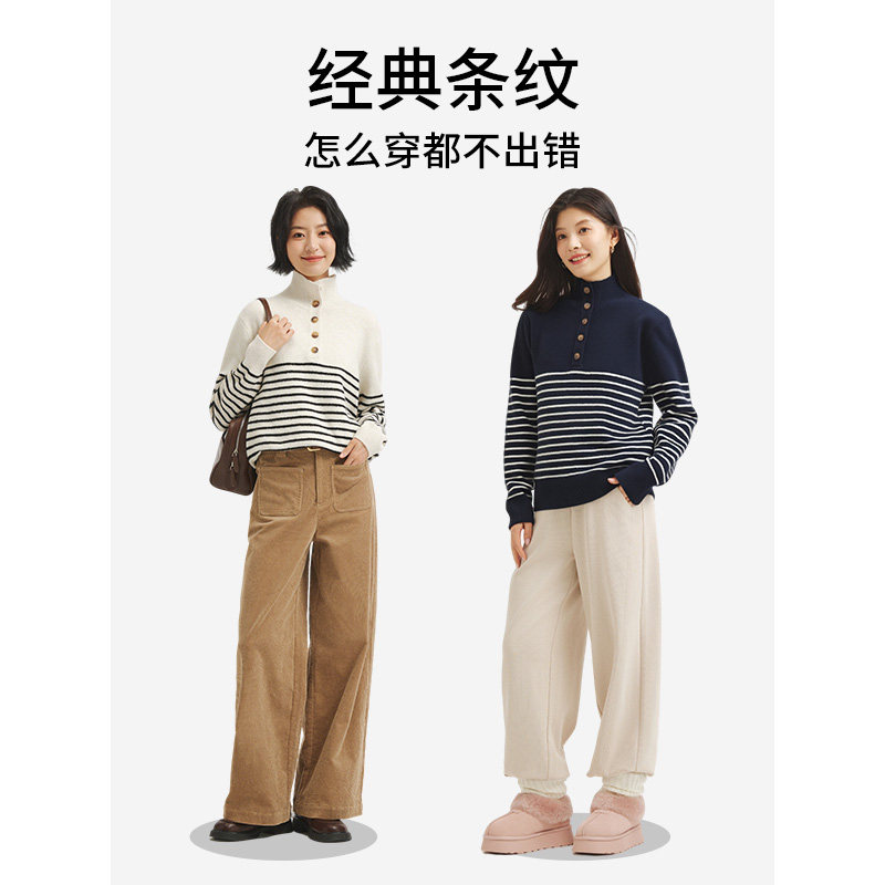 热风女士条纹毛衣2025年冬季新款厚款立领翻领两穿绒感条纹针织衫