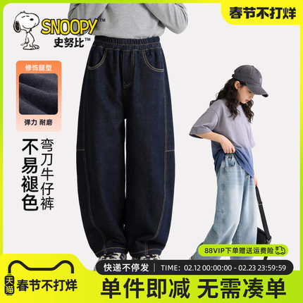 史努比女童牛仔裤2026新款弯刀裤女孩阔腿裤黑色休闲长裤儿童裤子