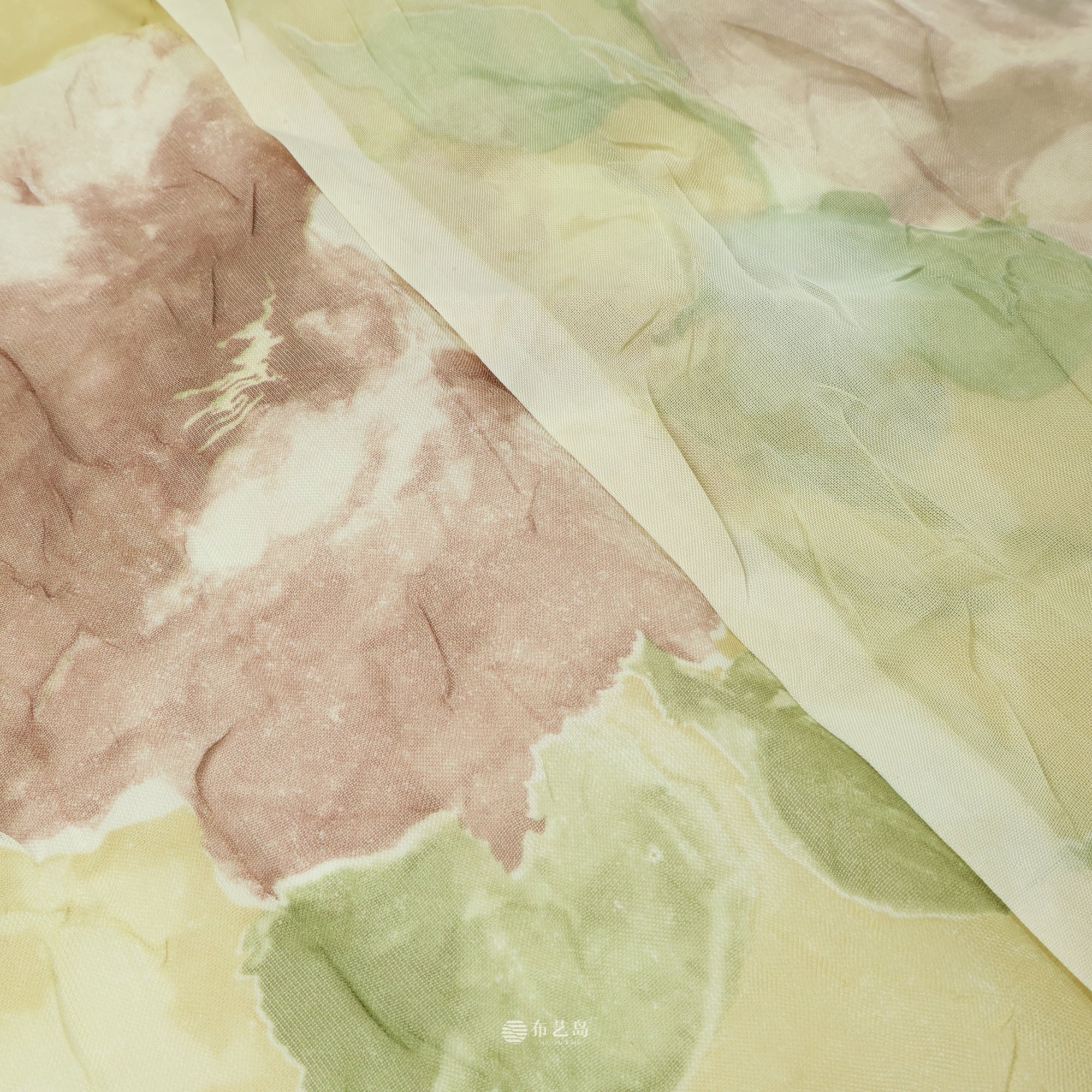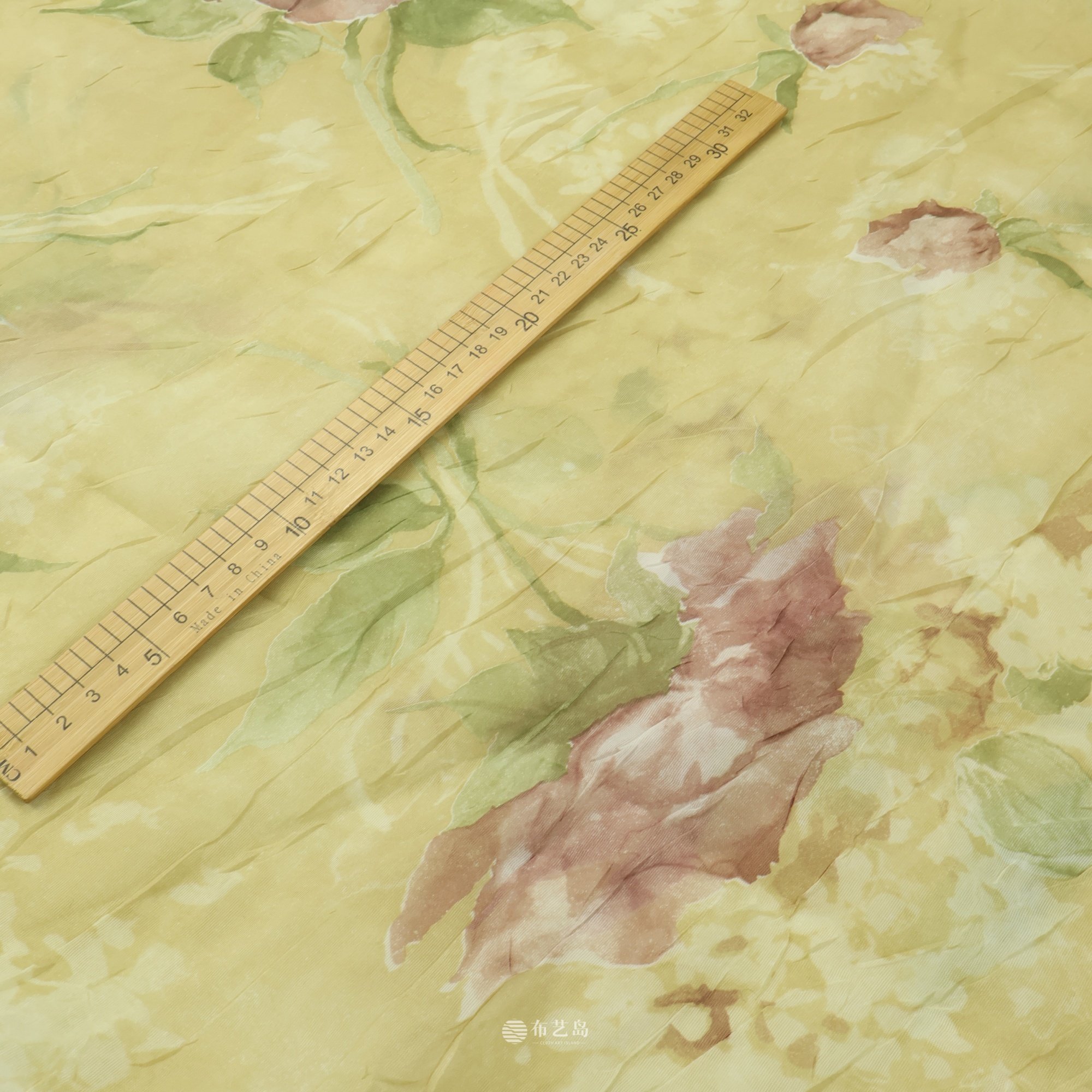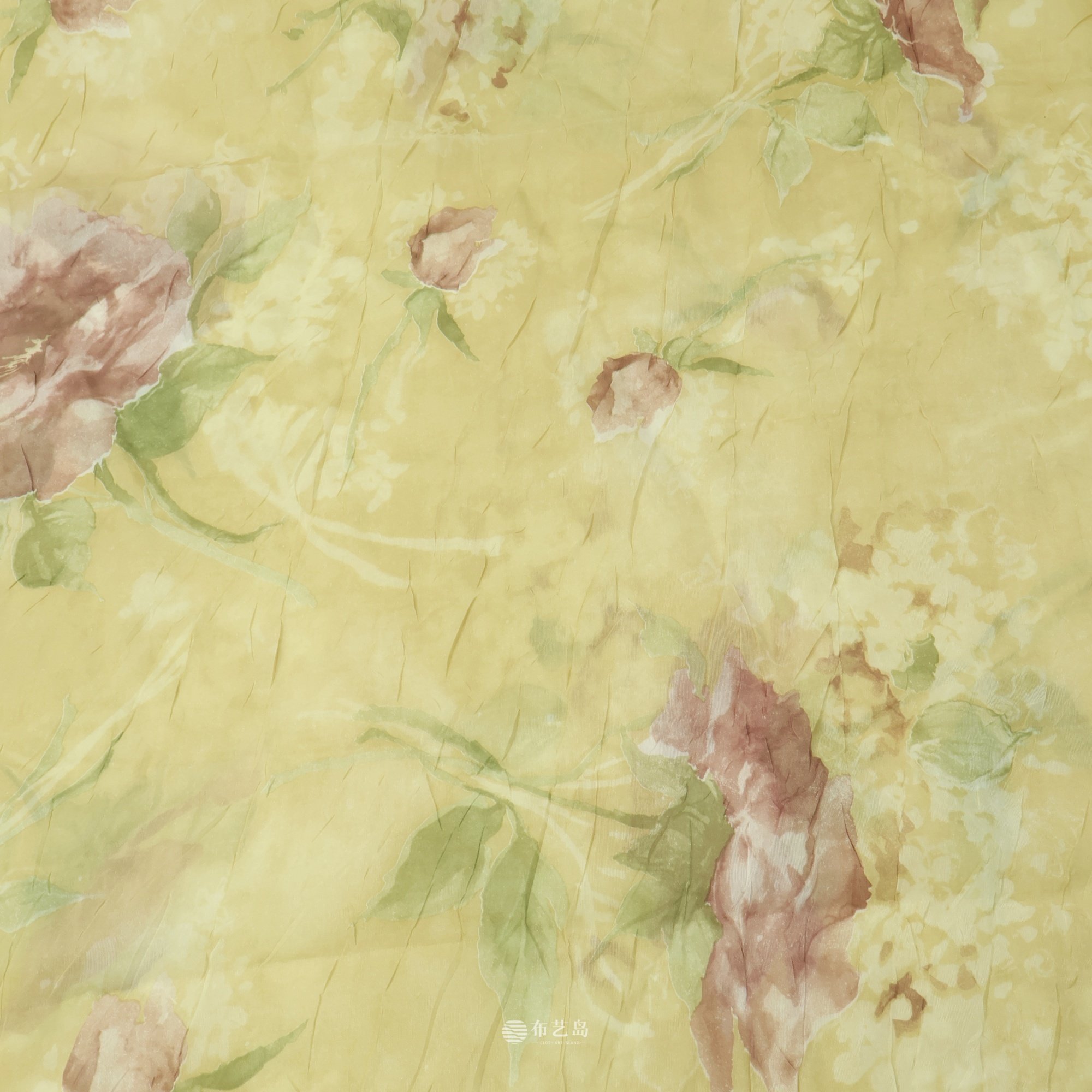 垂感半透 复古黄色玫瑰大花印花褶皱欧根纱布料 汉服背景面料B