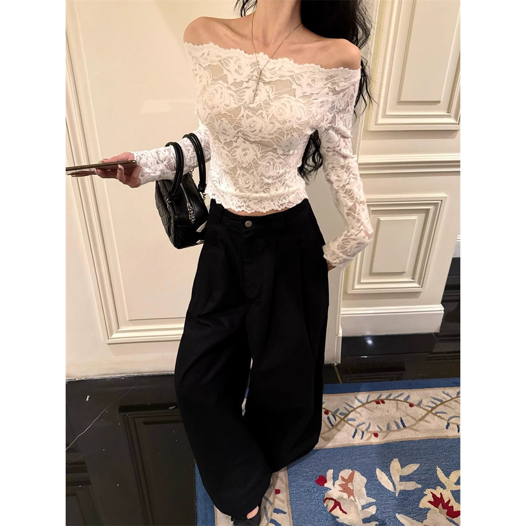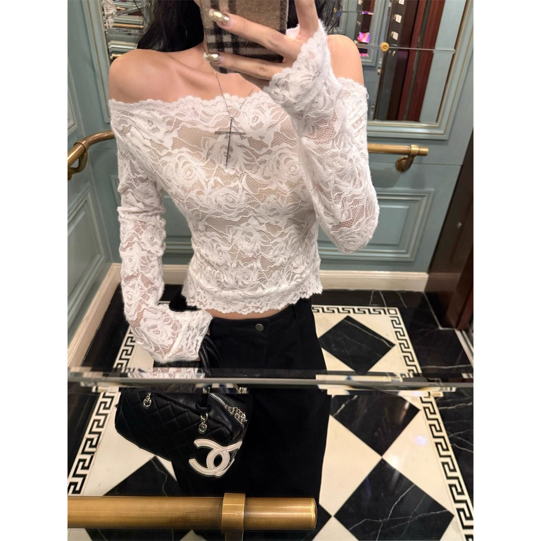 法式一字肩蕾丝长袖t恤女生冬季新款修身显瘦纯欲风绑带露肩上衣