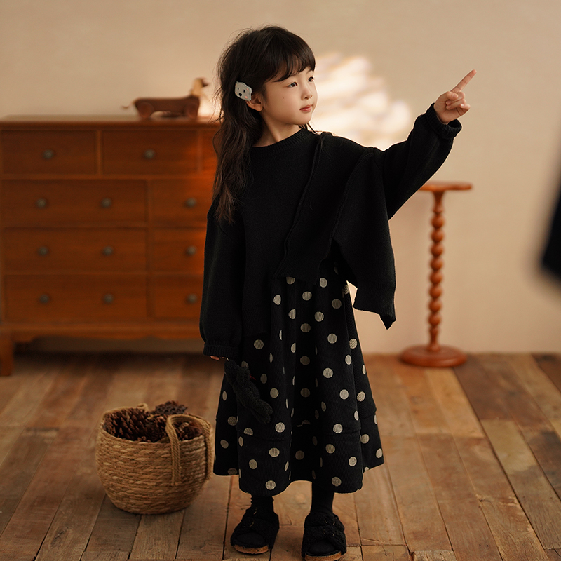 砚台家童装复古森系儿童灯芯绒波点半身裙女童拼接长裙秋冬装黑色