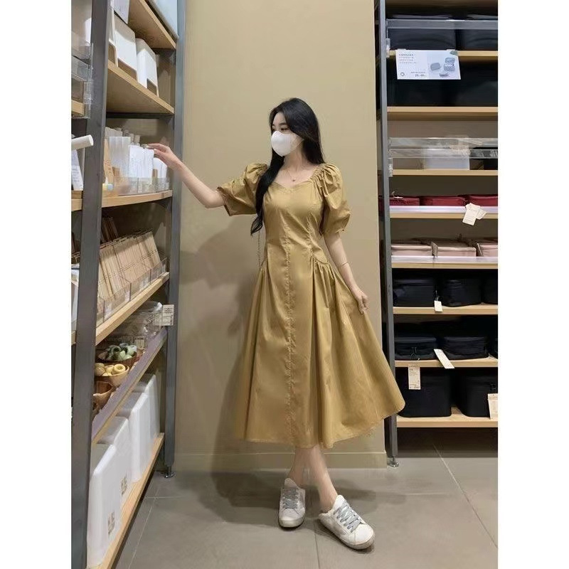 法式茶歇泡泡短袖连衣裙女2025夏季新款高级感气质收腰显瘦中长裙