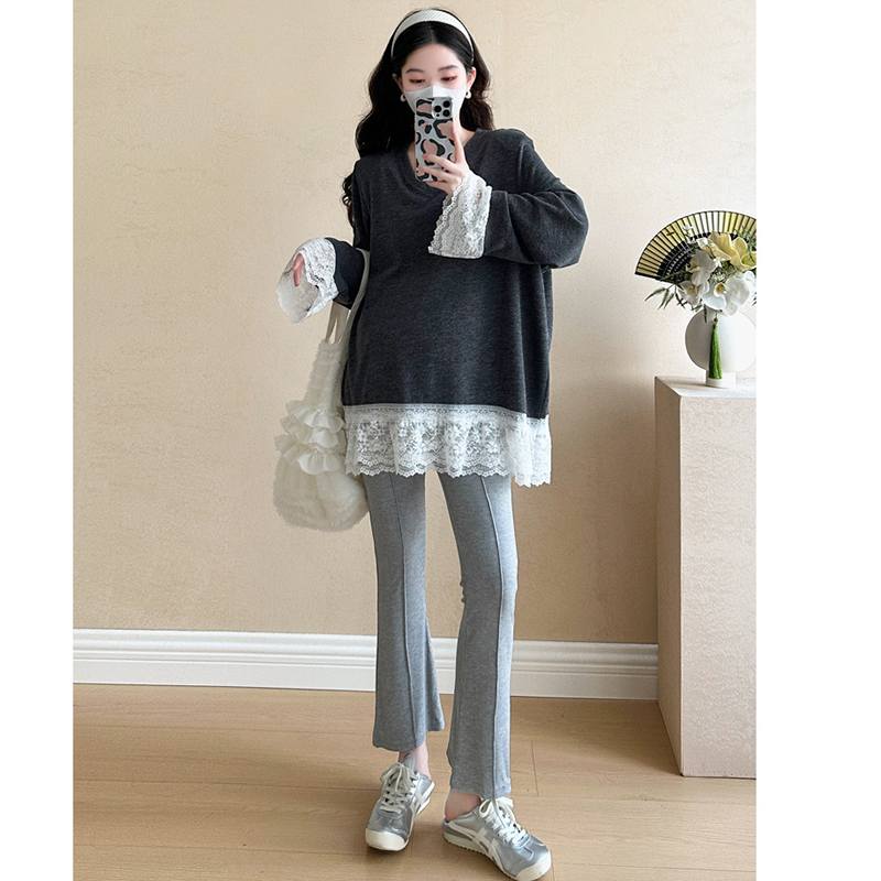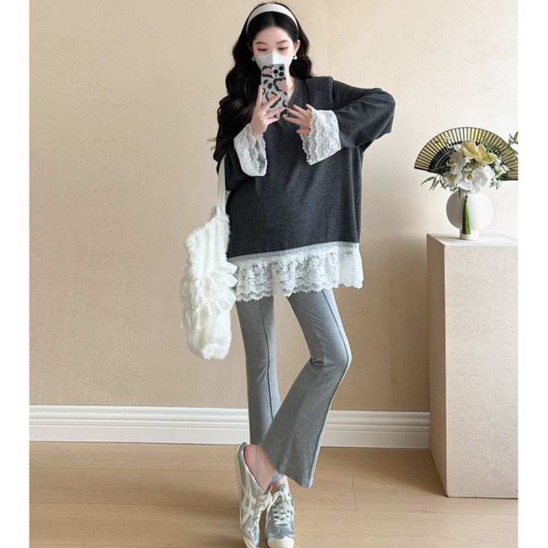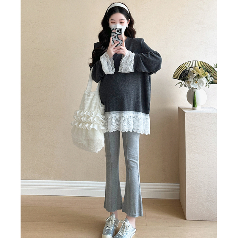 孕妇套装春秋2025新款韩版灰色蕾丝拼接花边中长款上衣裤子两件套