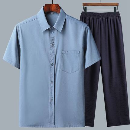 中老年男士短袖衬衫套装夏季宽松冰丝纽扣商务衬衣老人爷爷爸爸装