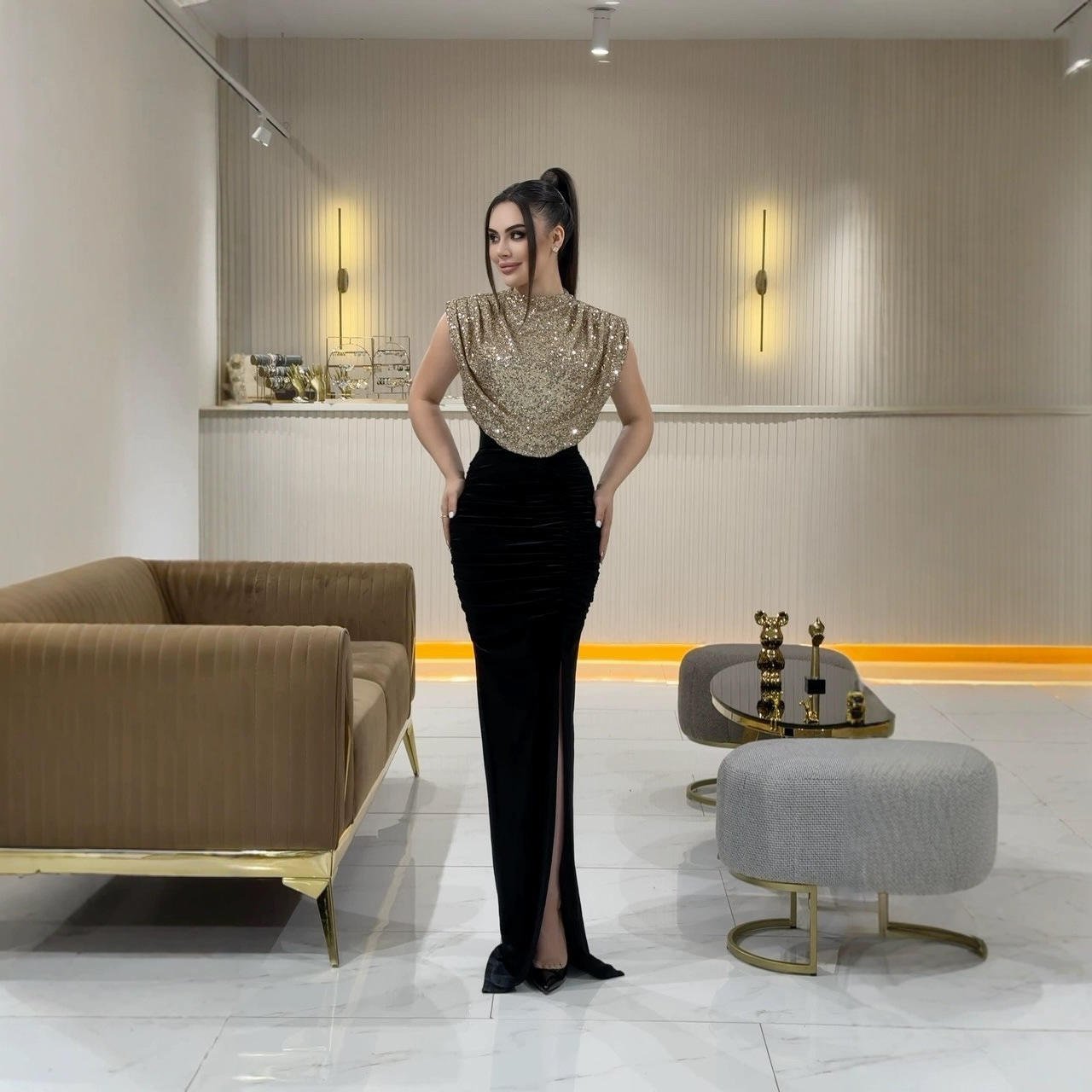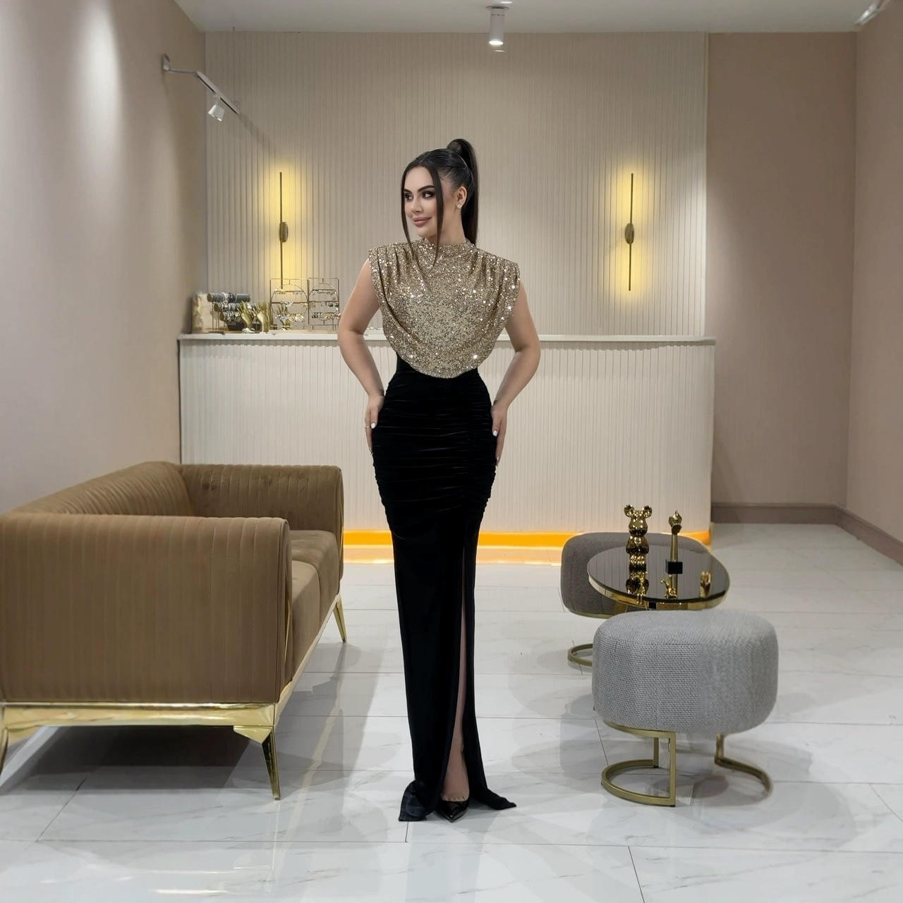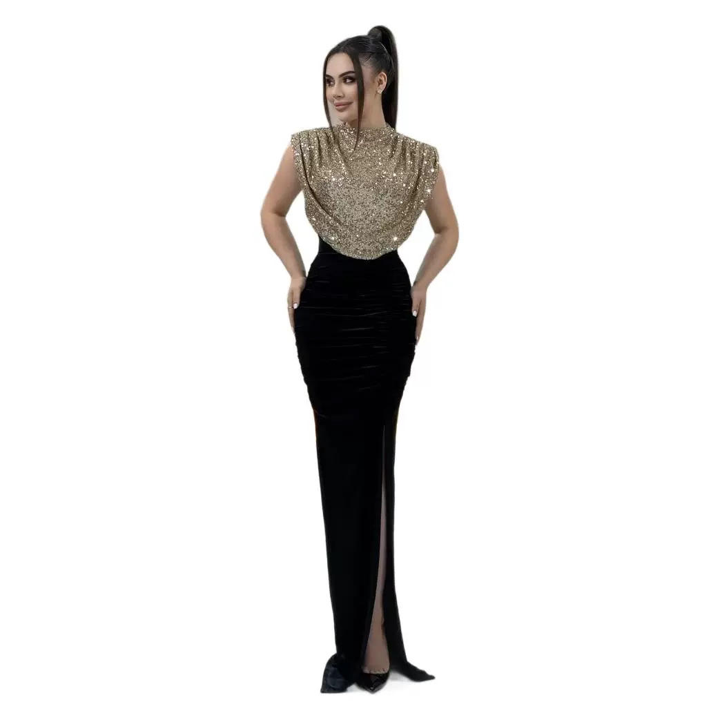 亮片高级感晚拼接开叉宴会气质轻奢鱼尾长裙连衣裙聚酯纤维广州