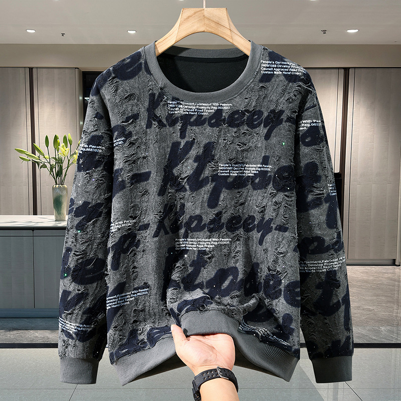 春秋季加肥加大圆领卫衣男宽松破洞风长袖T恤潮胖子大码上衣300斤