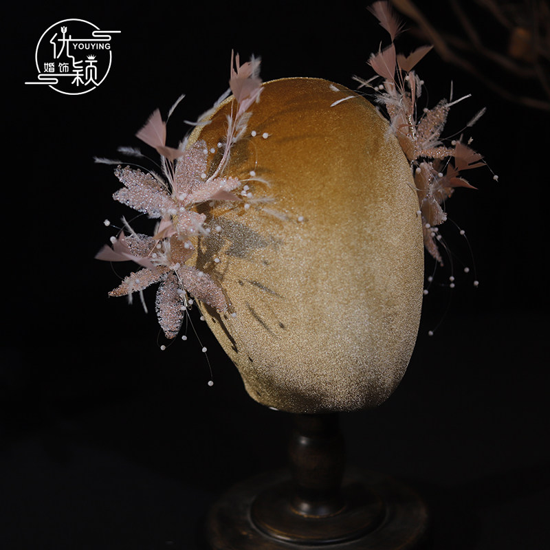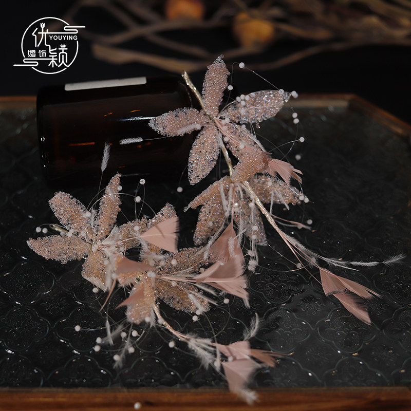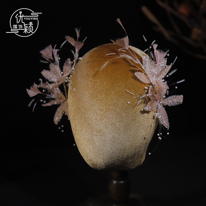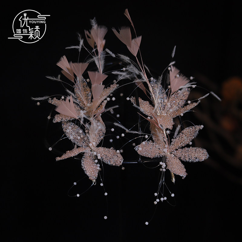 精致手作仙女粉色米珠花瓣新娘羽毛头饰减龄韩系跟妆婚纱礼服发饰