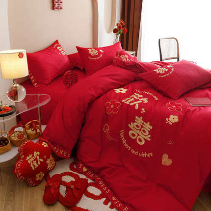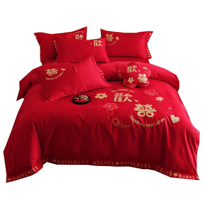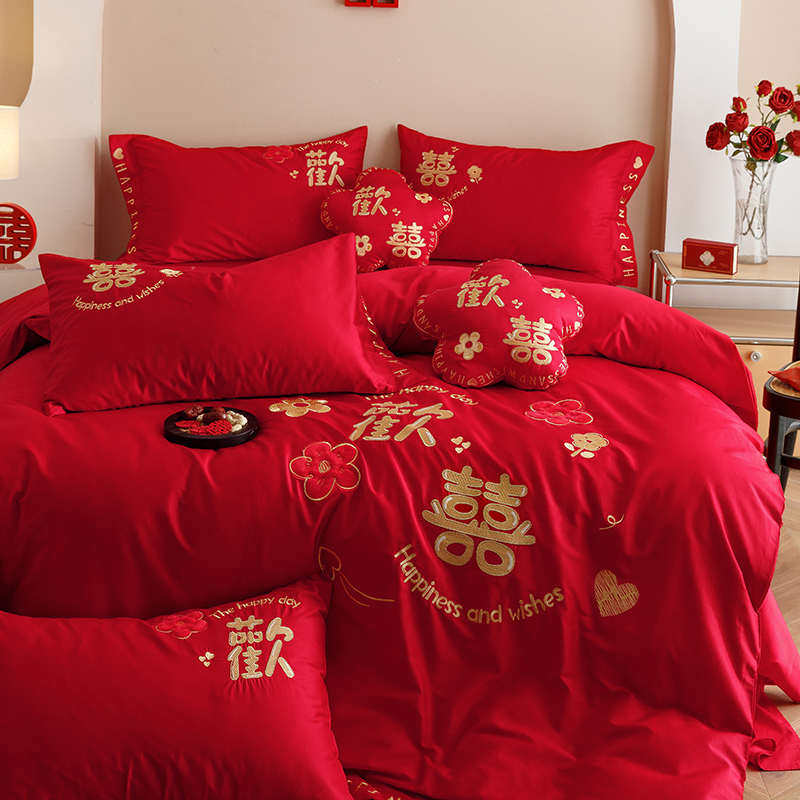 高档结婚四件套红色高级感刺绣被套陪嫁床单婚嫁喜被婚庆床上用品
