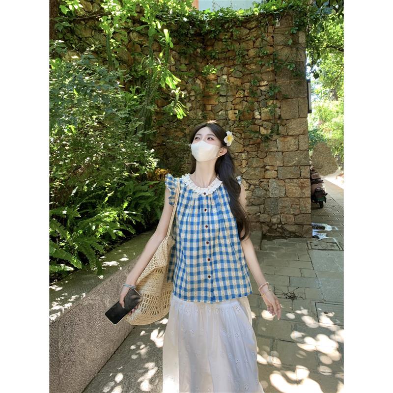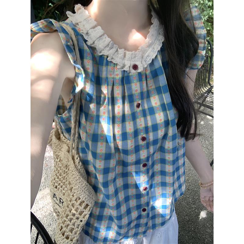 韩系格子甜美碎花蕾丝拼接短袖背心衬衫女夏季法式小资小飞袖上衣