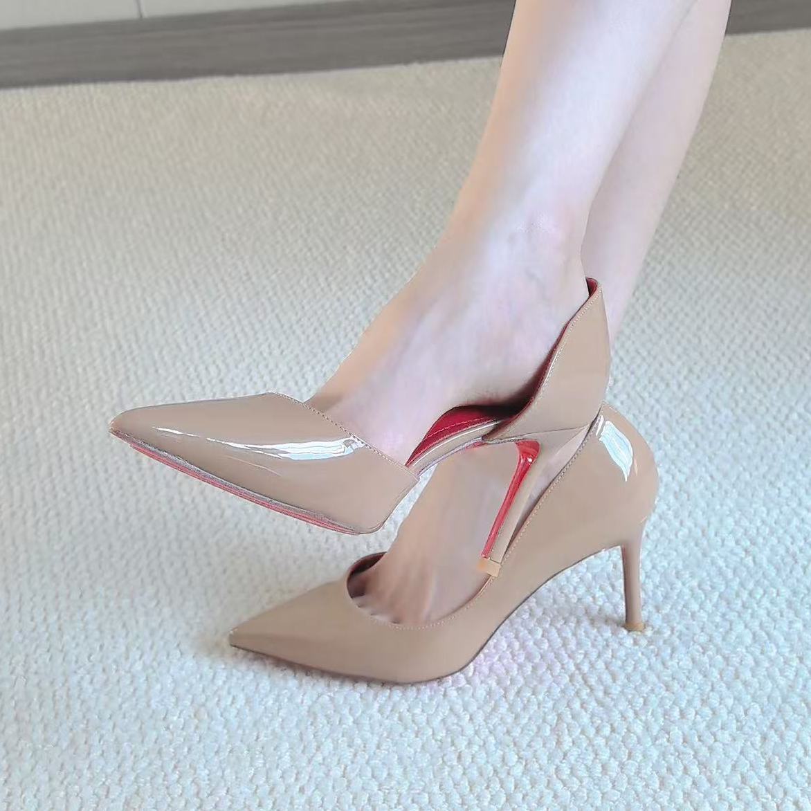 2025新款尖头侧空气质裸色高跟鞋女绝美细跟御姐性感单鞋漆皮职业