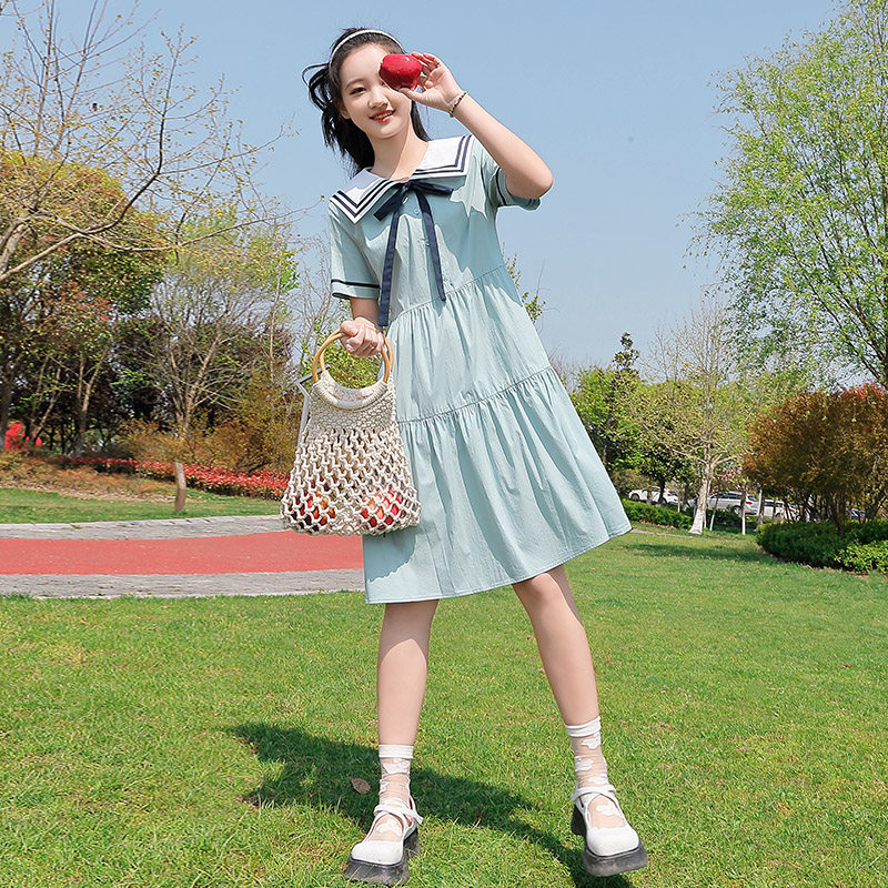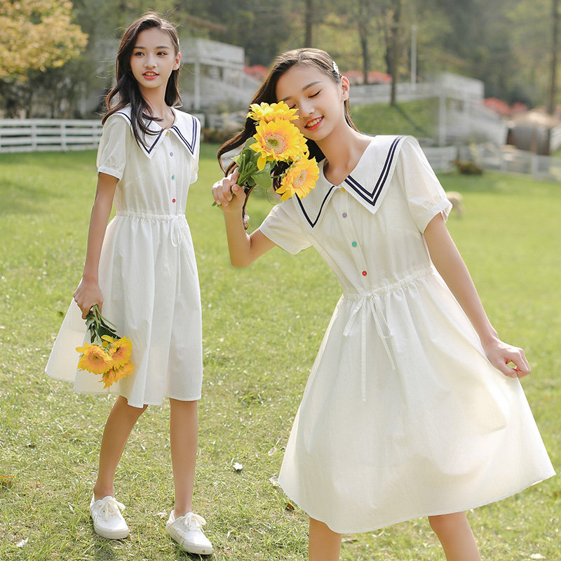 少女大童连衣裙夏季2024新款显瘦海军学院风高中女生初中学生裙子