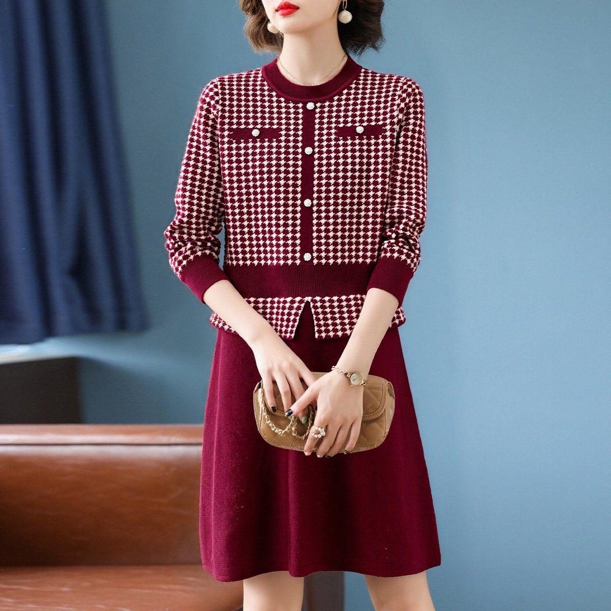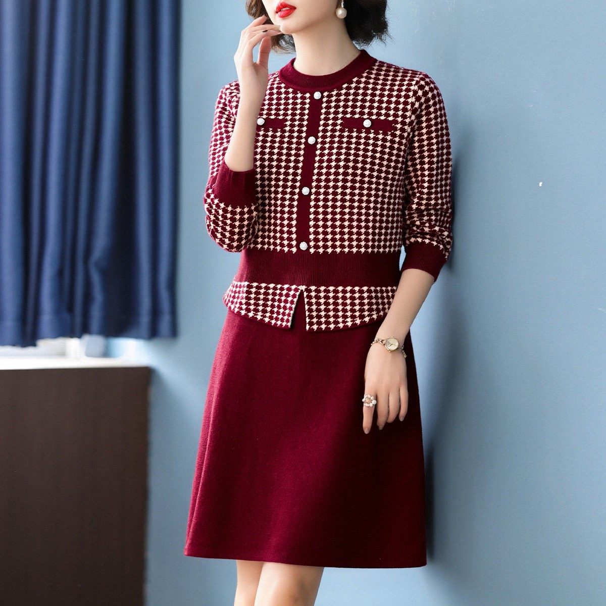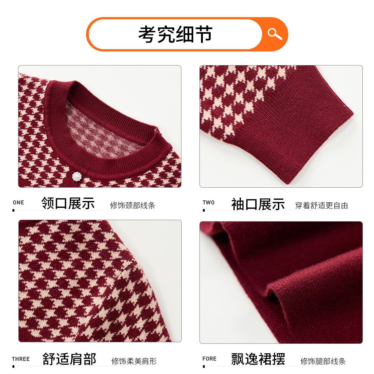 妈妈洋气毛衣连衣裙中年女装秋冬装中长款打底衫中老年千鸟格裙子