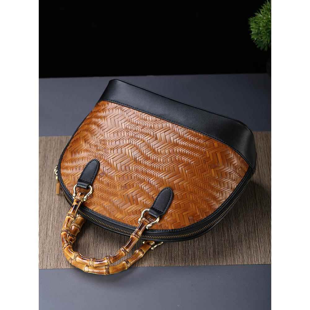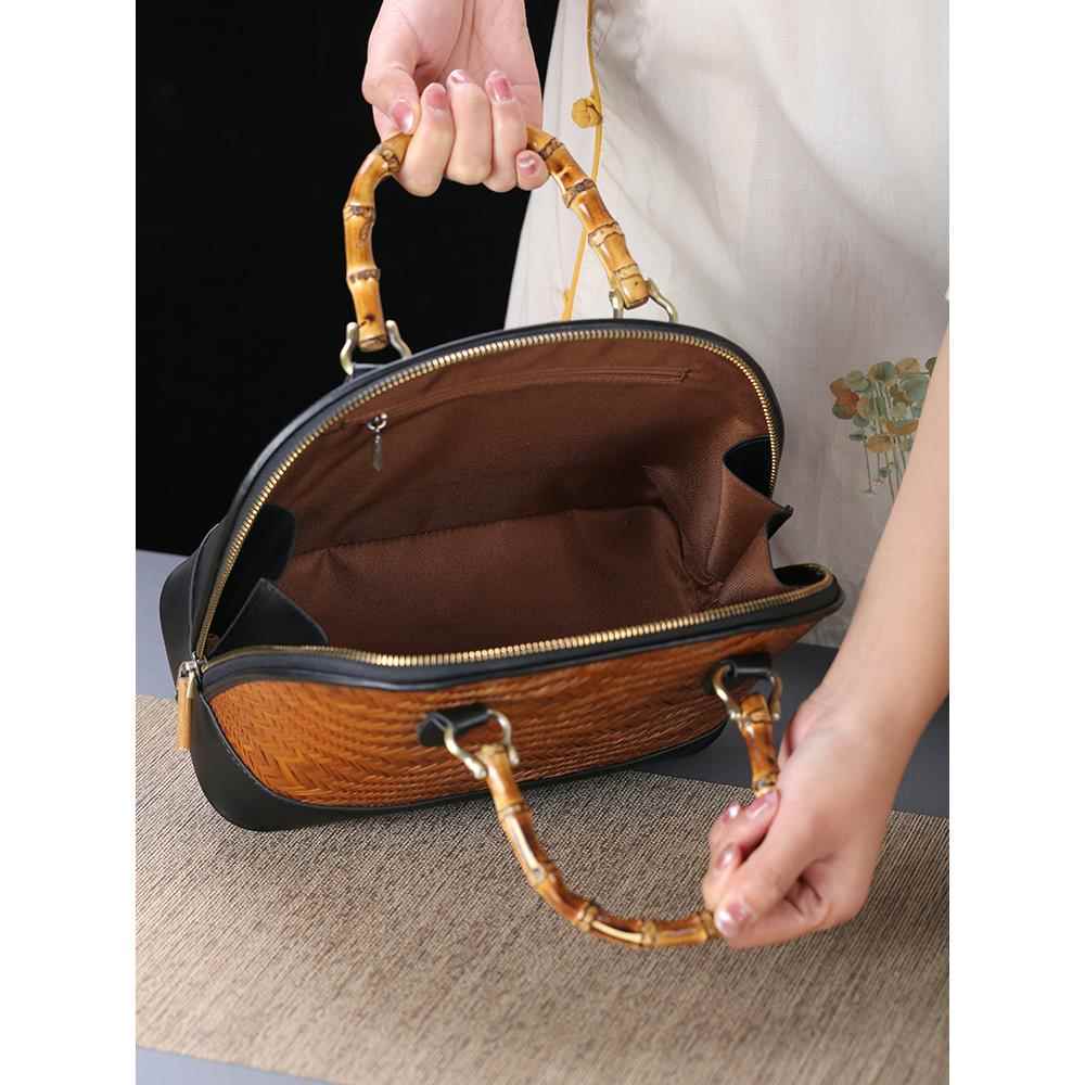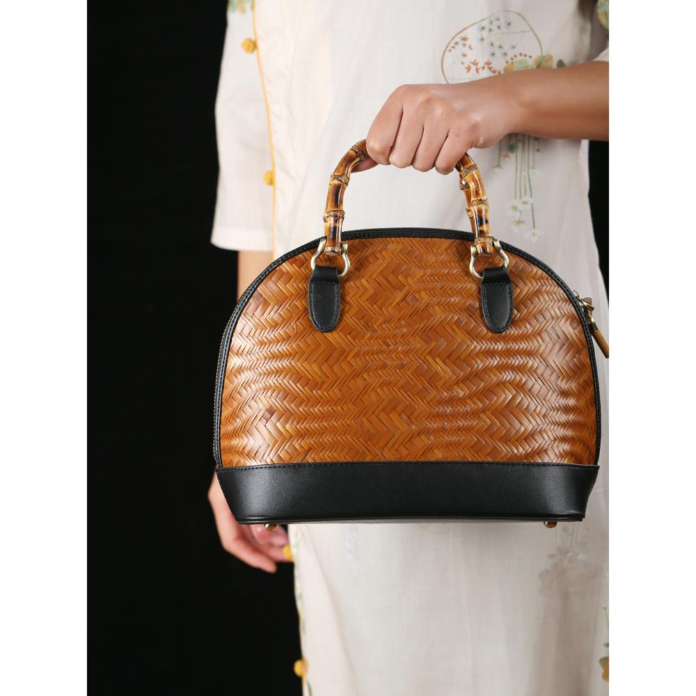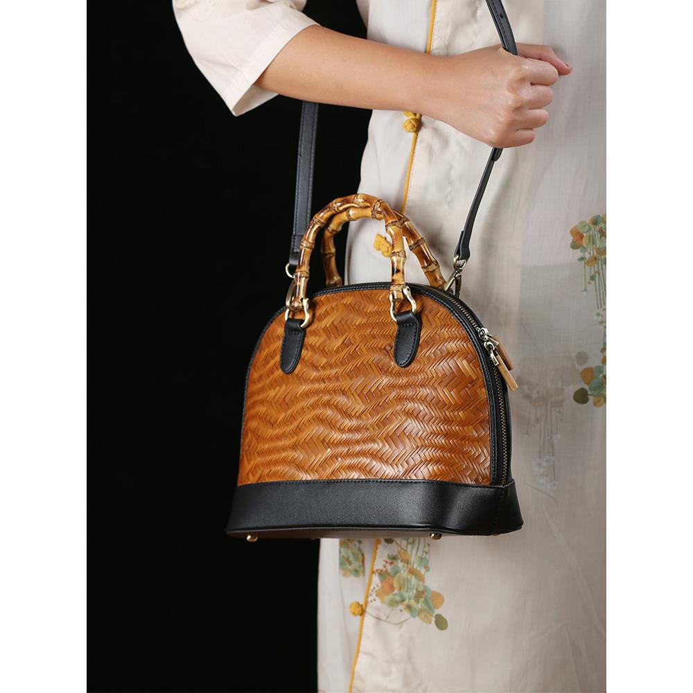 竹其阁覆古手工竹制牛皮斜挎包手提袋大容量文编女式包