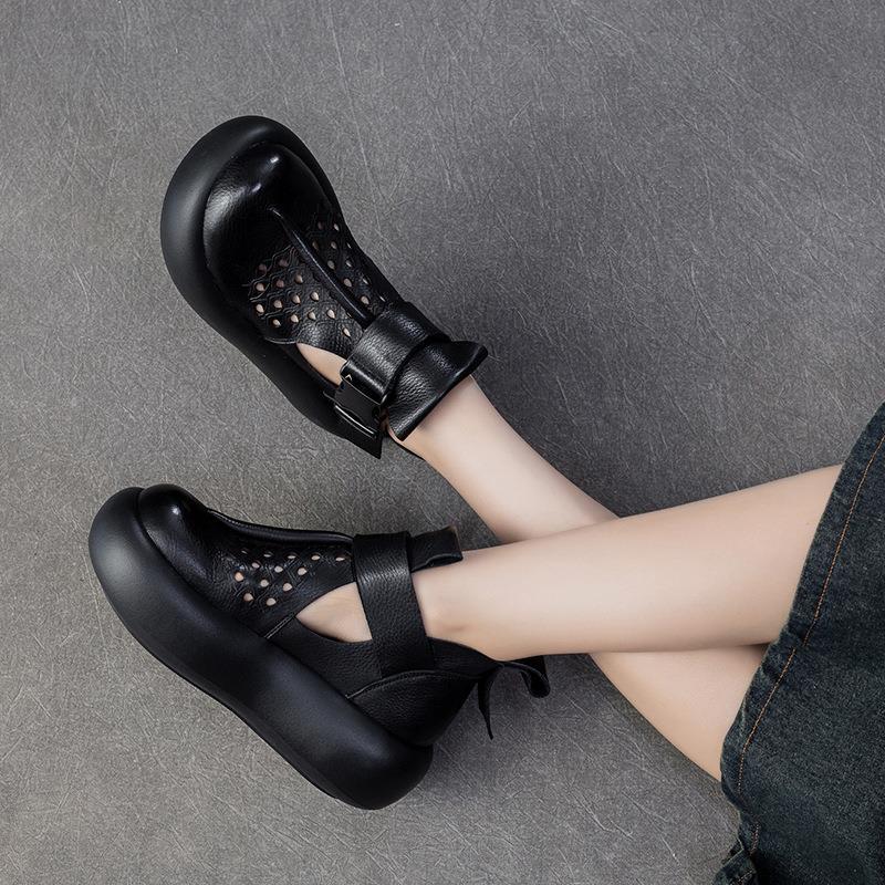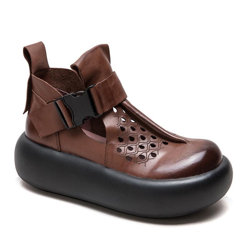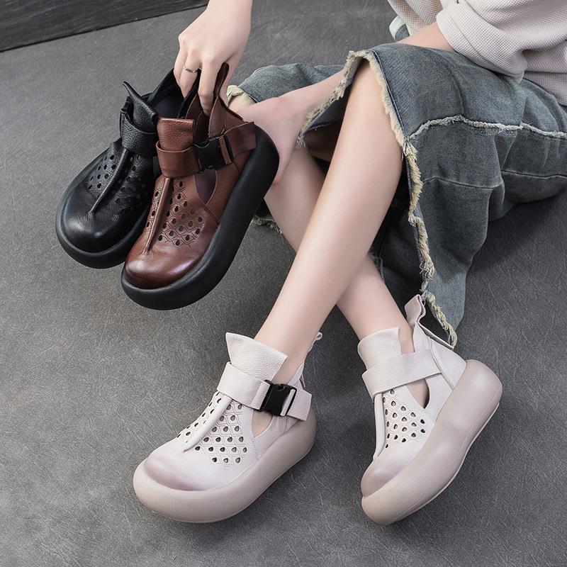 2025秋季新款镂空复古风头层牛皮高帮时尚洞洞鞋厚底透气凉靴