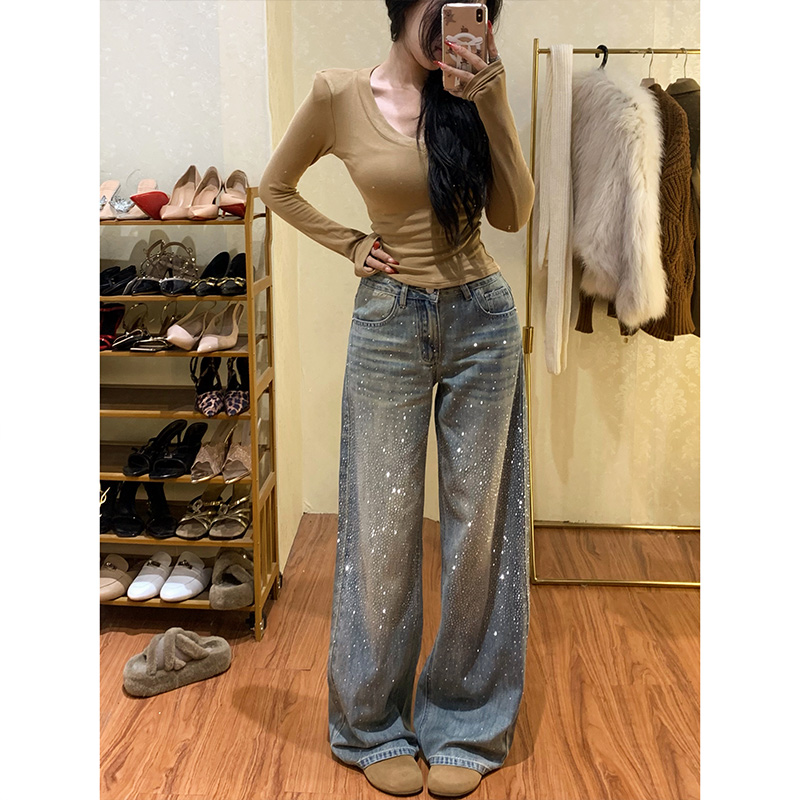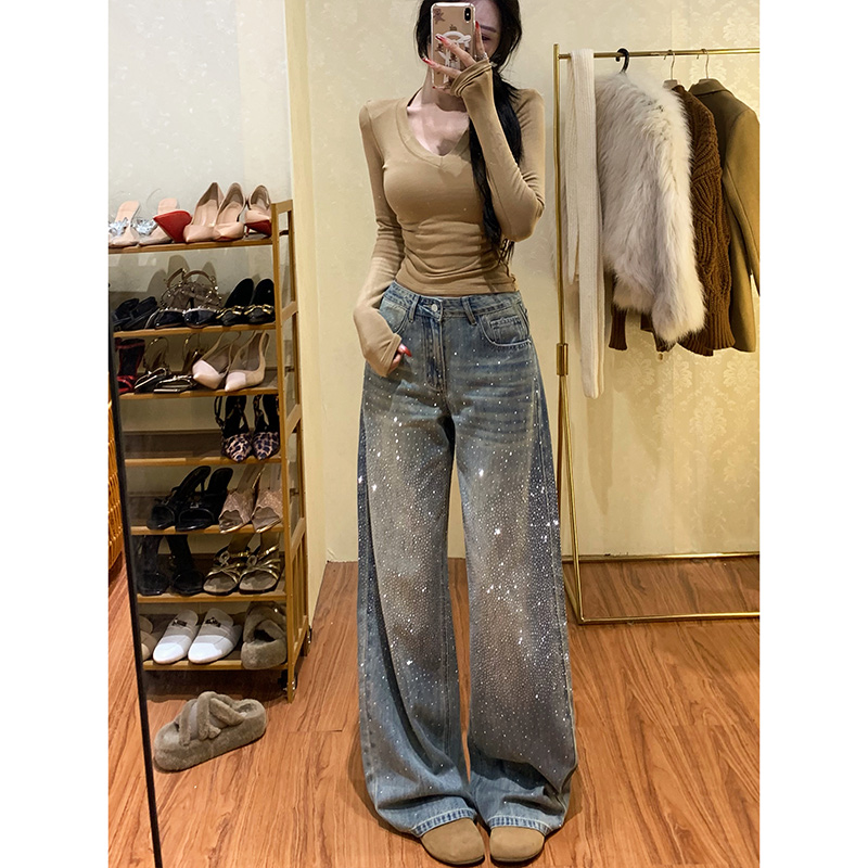耀眼星河烫钻加绒牛仔裤女2025年冬季新款高腰宽松显瘦阔腿堆堆裤