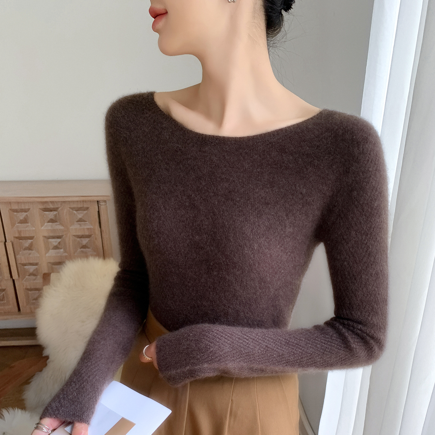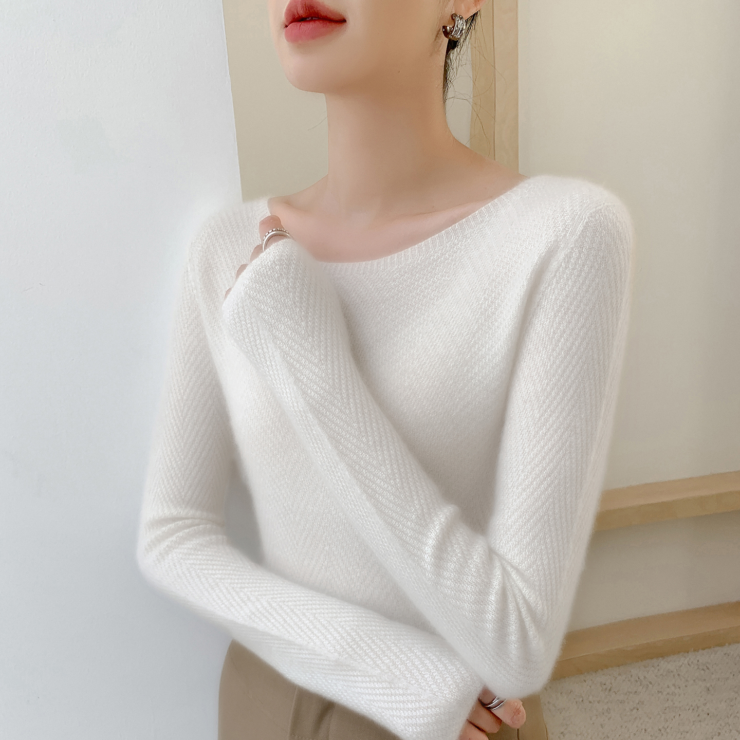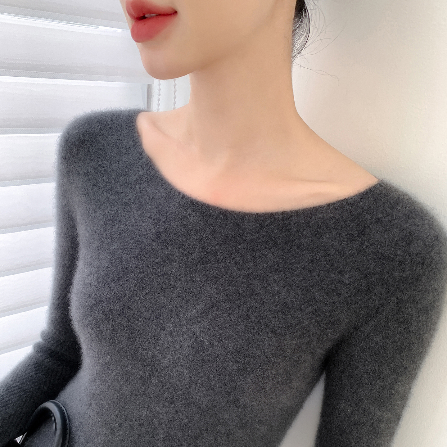 无缝一字领100纯山羊绒衫女修身毛衣显瘦软糯一线成衣针织打底衫