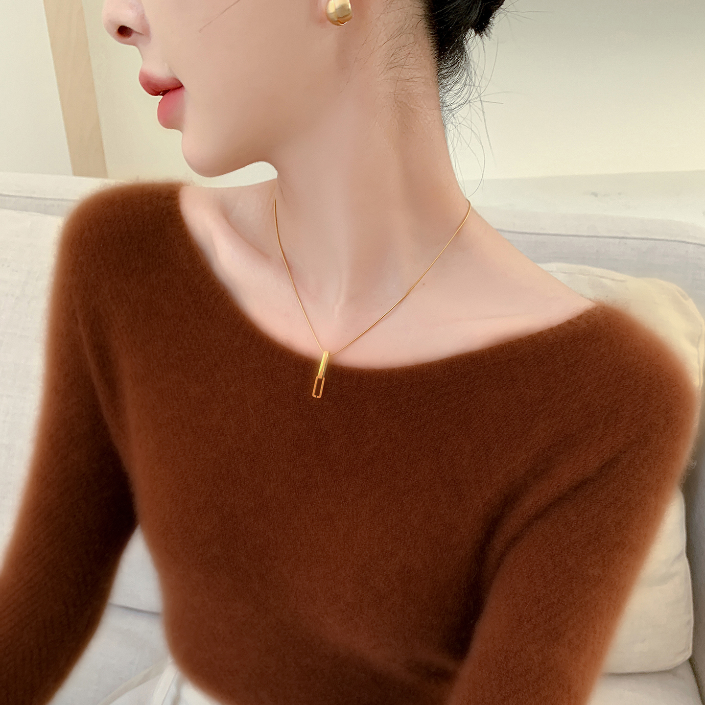 无缝气质一字领100纯山羊绒衫女