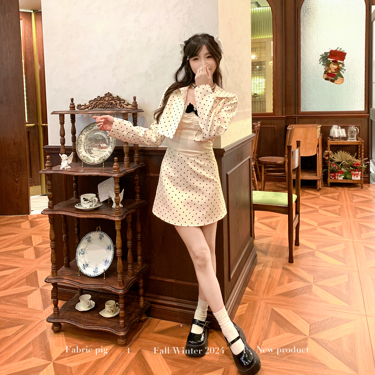 织物猪 春日梦境 miu系千金风波点套装女秋吊带连衣裙+外套两件套