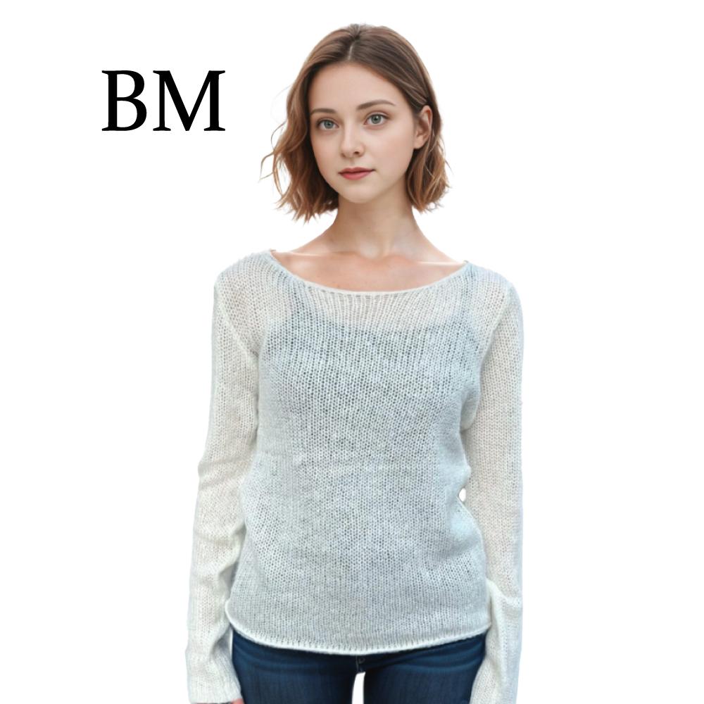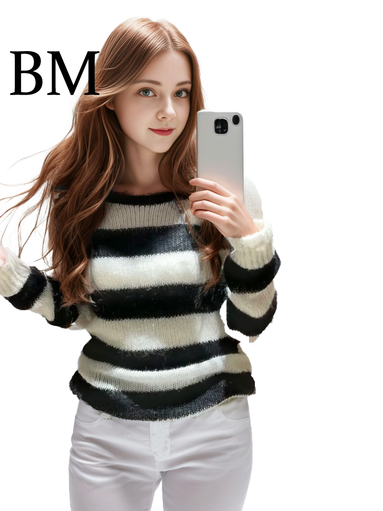 BM马海毛黑白条纹毛衣慵懒感宽松长袖薄款露肩显瘦镂空针织罩衫新