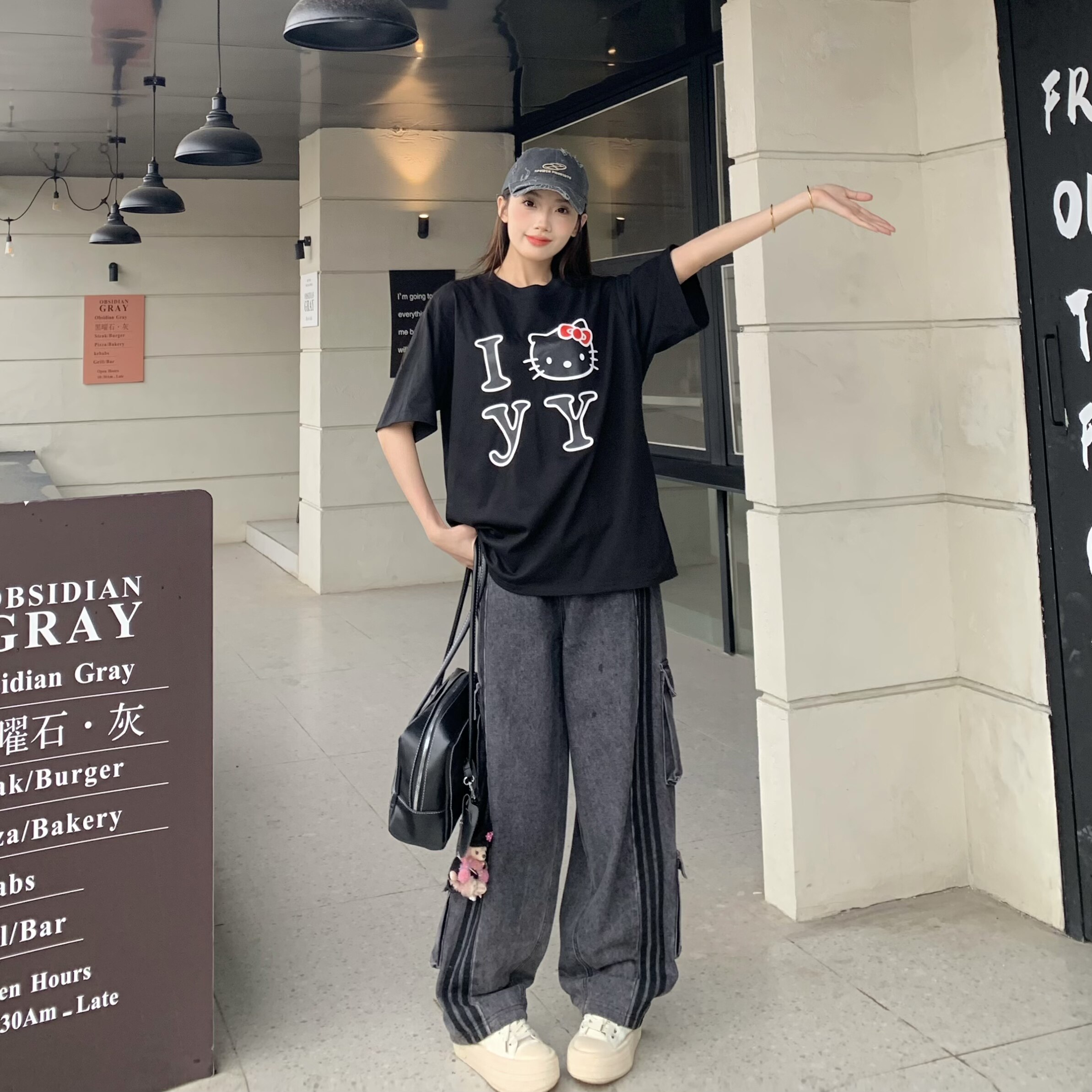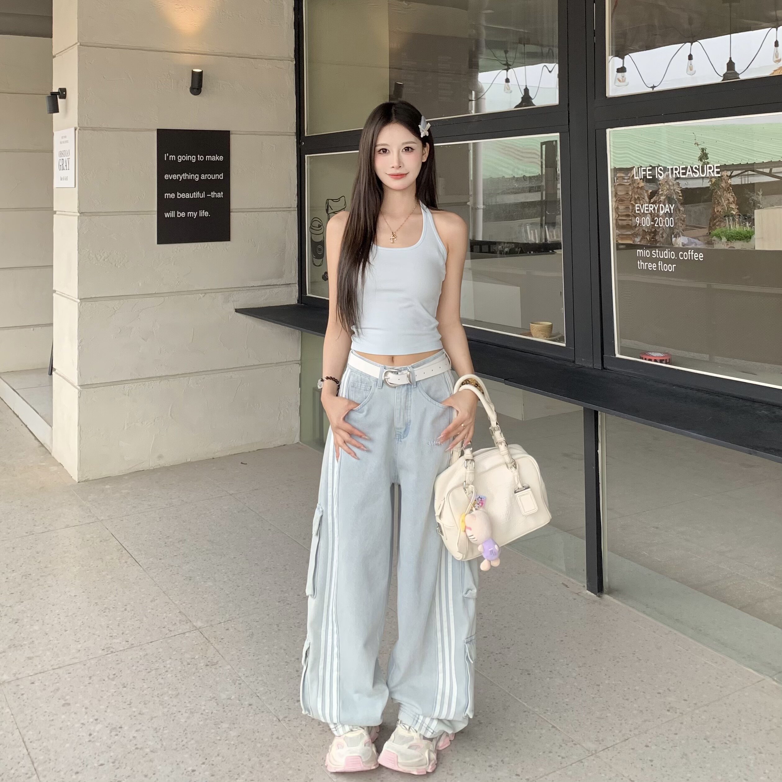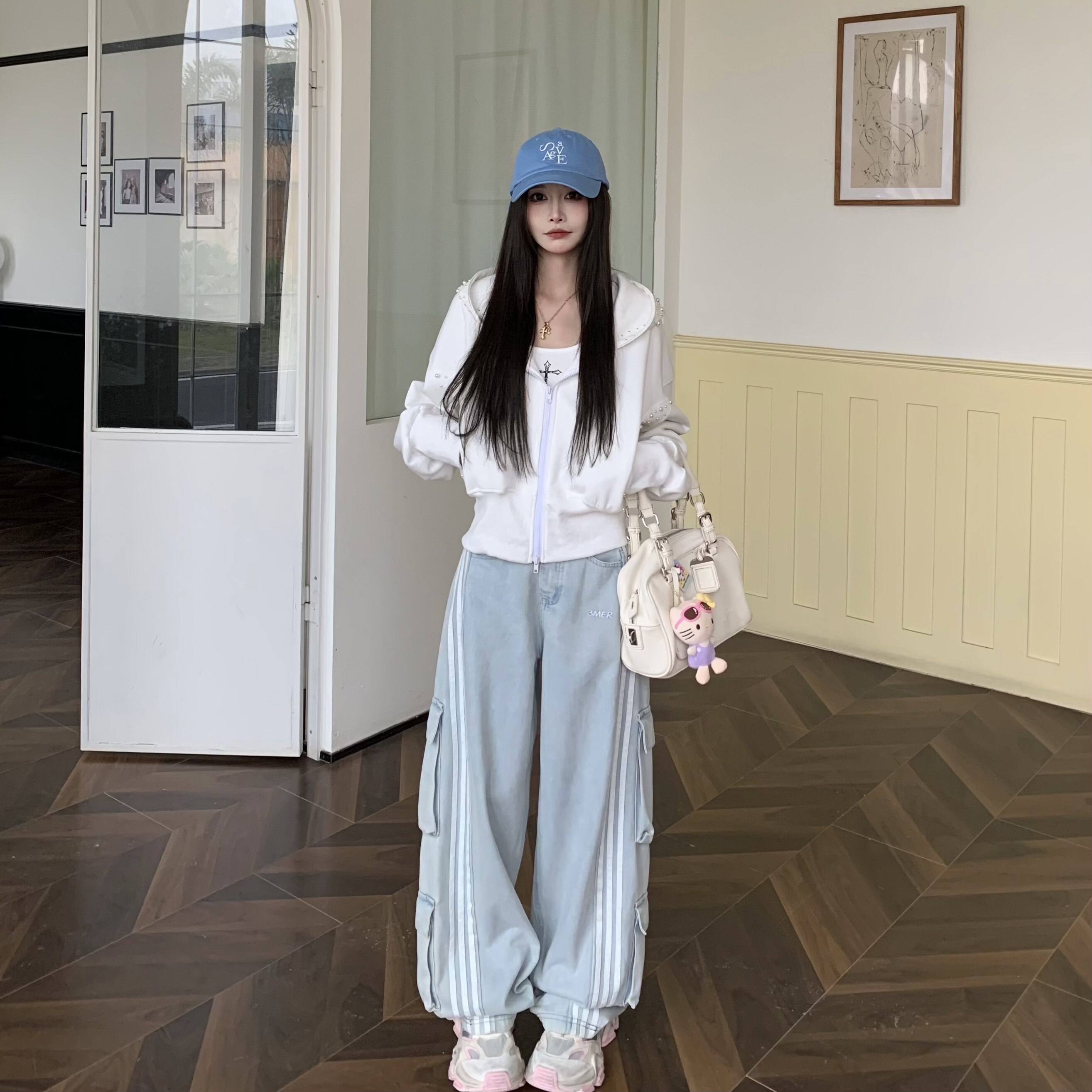 3MER哦哦三妹复古水洗多口袋工装牛仔裤女宽松三条杠阔腿弯刀裤