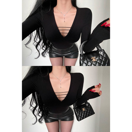 性感V领胸前绑带镂空长袖T恤上衣
