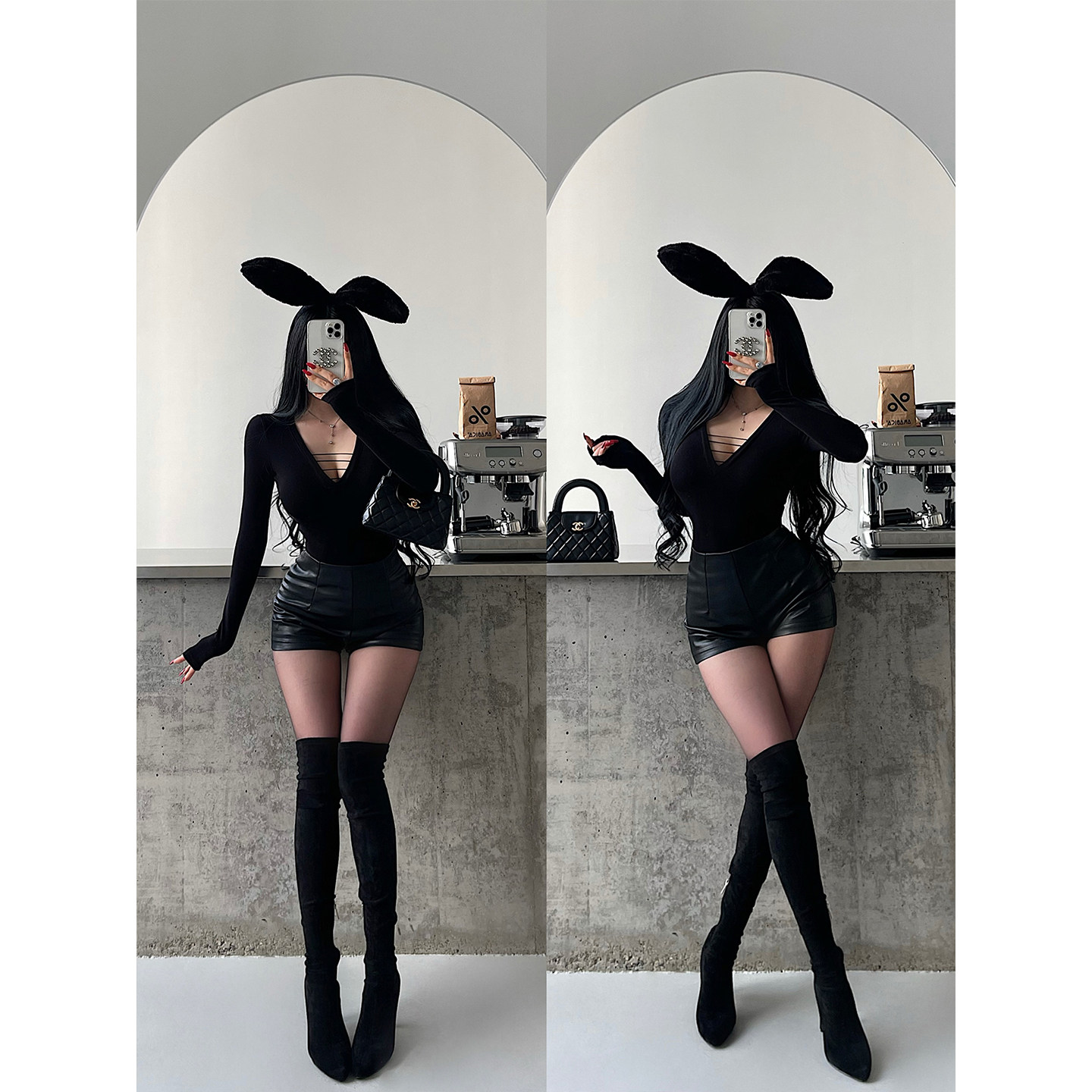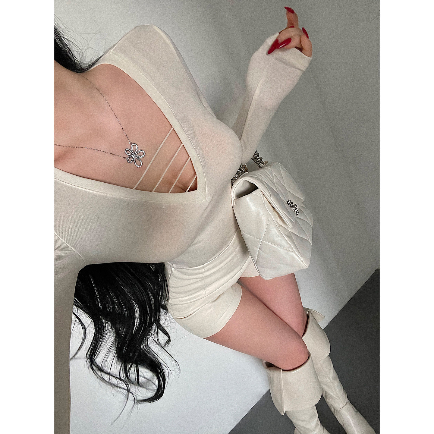 YoungGirlDay纯欲风性感V领胸前绑带镂空修身显瘦长袖打底T恤上衣