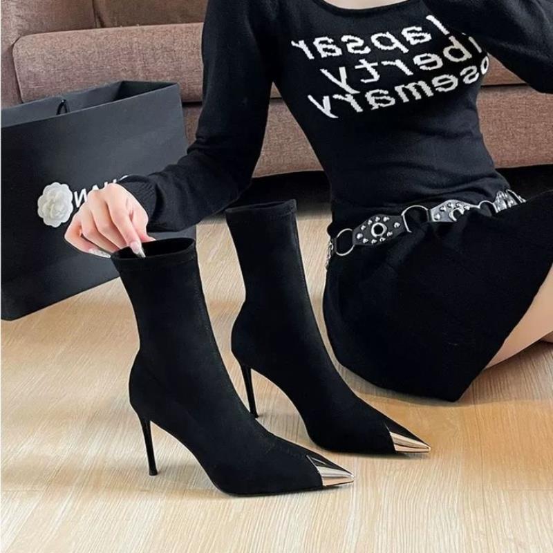 2025年秋冬季新款金属尖头高跟短靴细跟显瘦弹力靴百搭短筒女靴子
