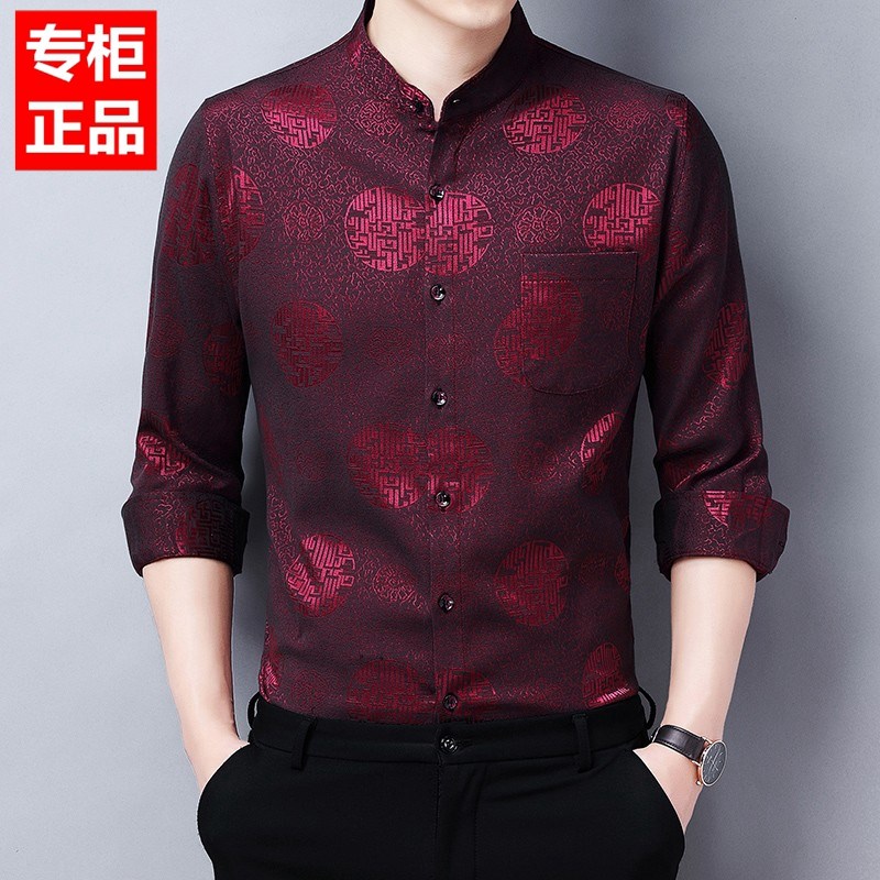 立领衬衫男长袖唐装中老年爸爸婚宴装结婚礼服喜公公春秋薄款衬衣