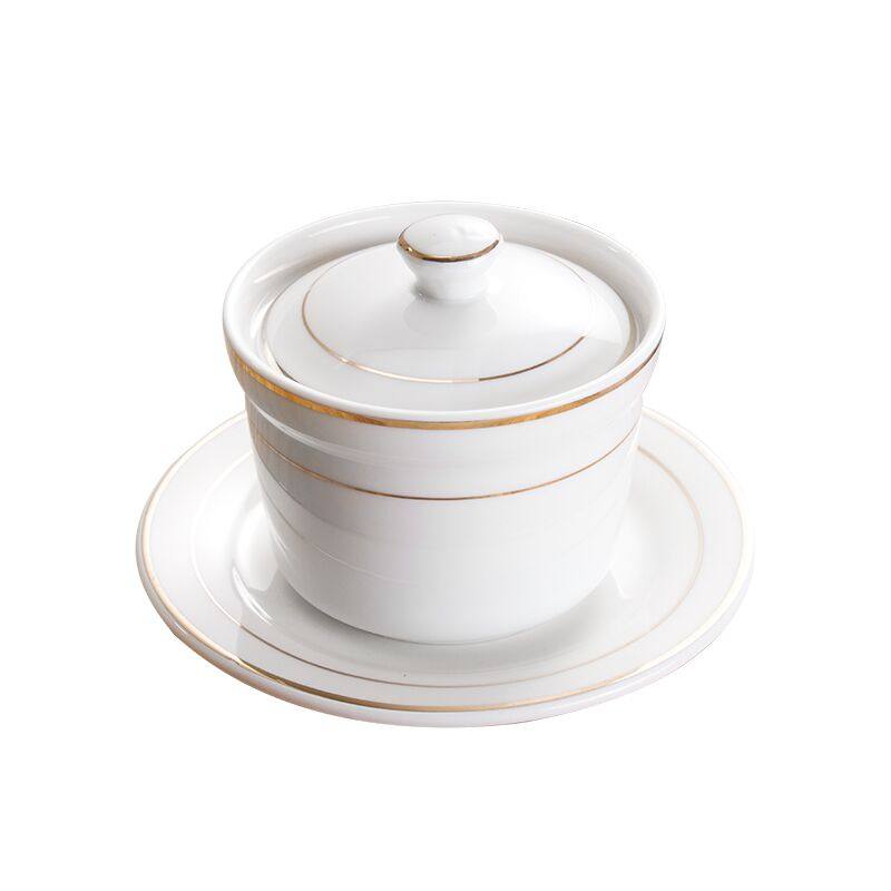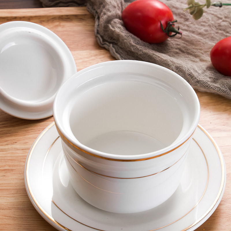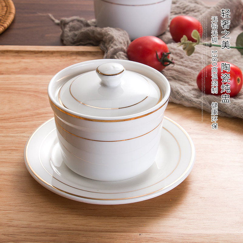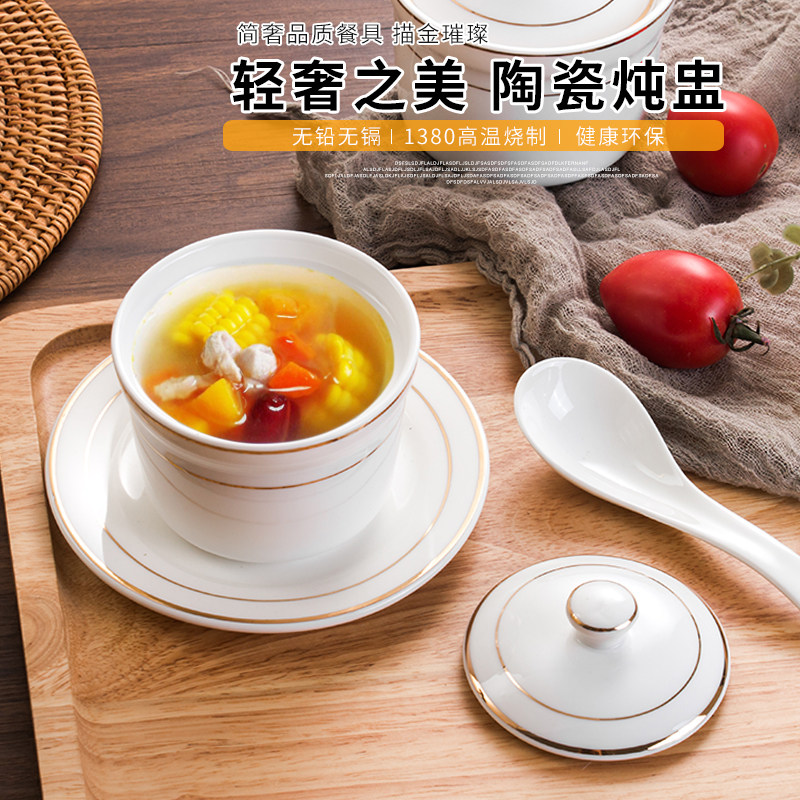 家用隔水炖锅燕窝雪蛤补品汤盅 陶瓷纯白圆形描金商用炖盅带盖