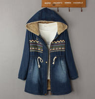2024冬装新款连帽针织拼接宽松中长款加绒加厚牛仔休闲棉衣棉服女