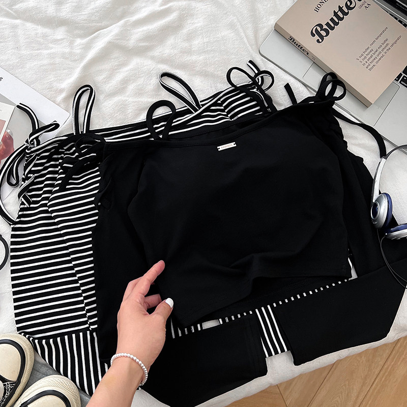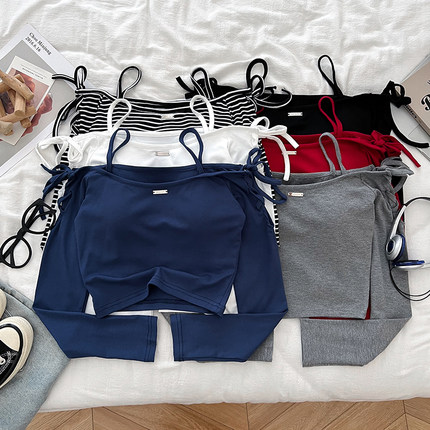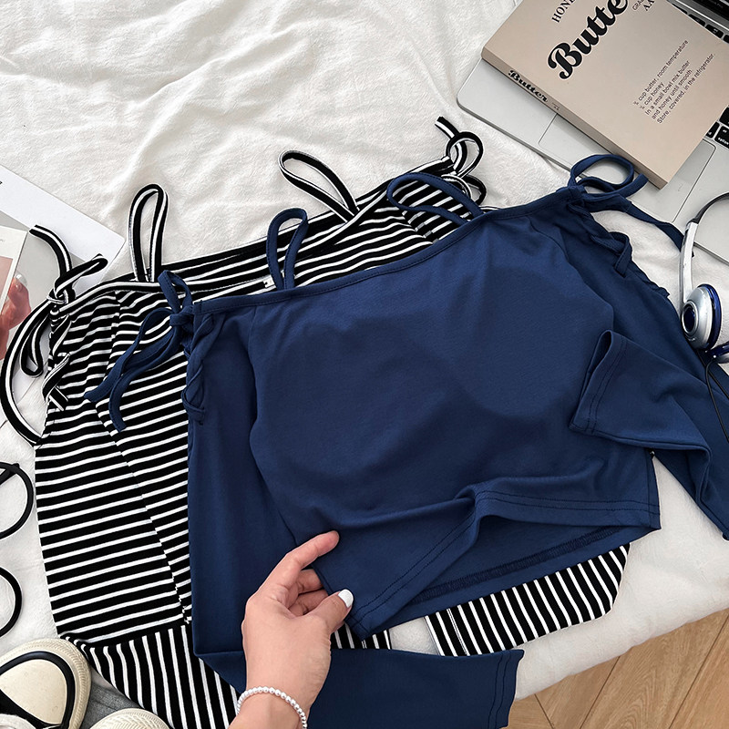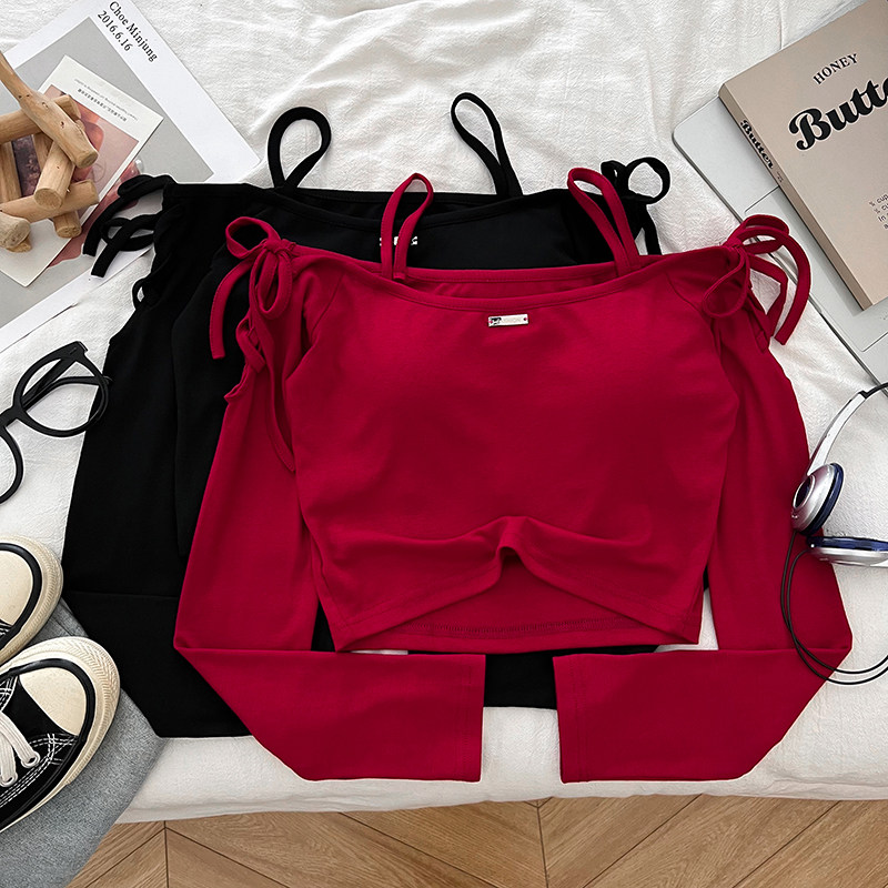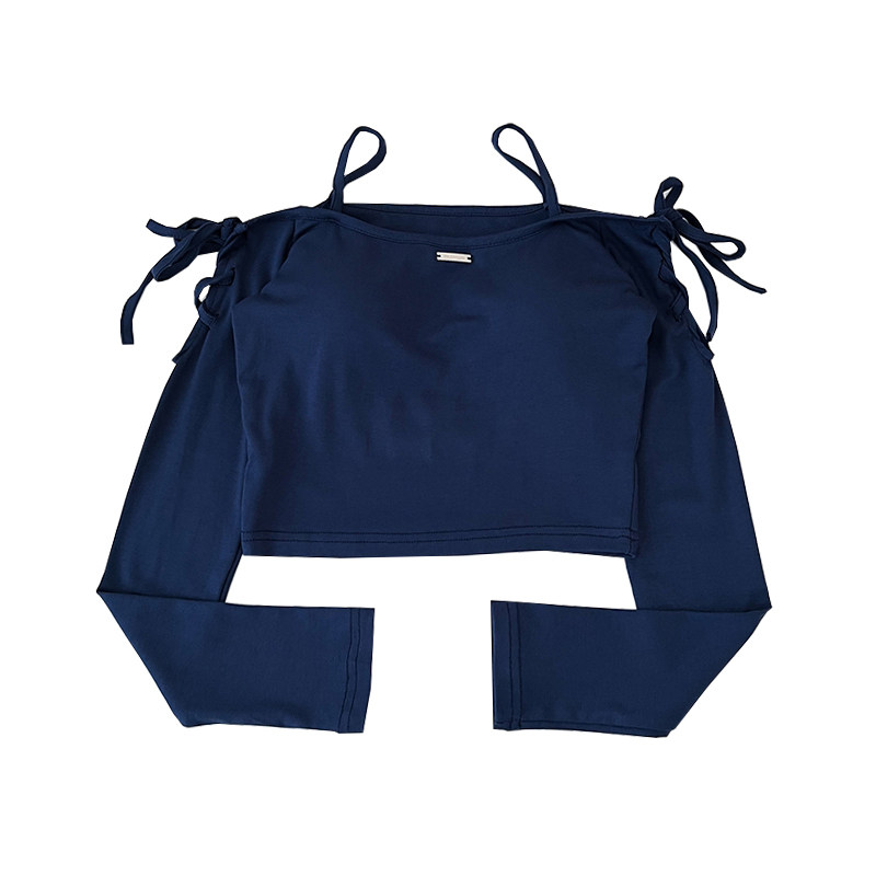 设计感时尚减龄露肩一字领交叉绑带修身显瘦短款长袖t恤上衣女