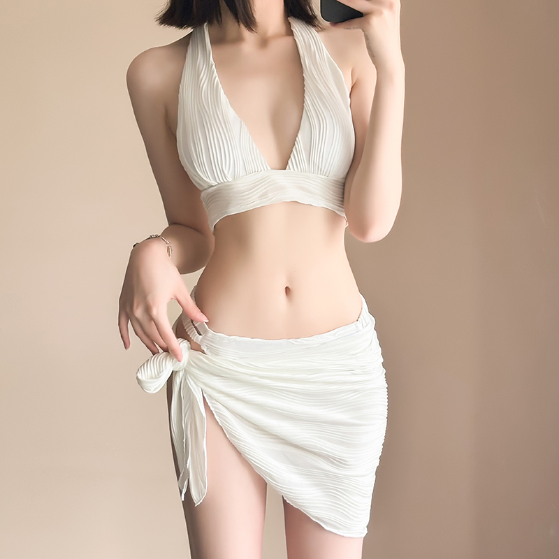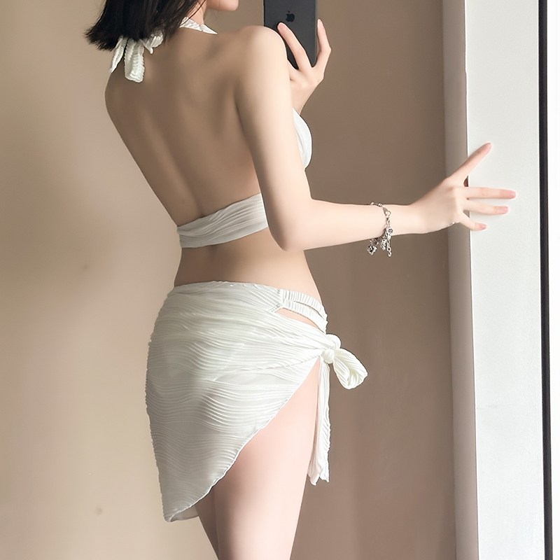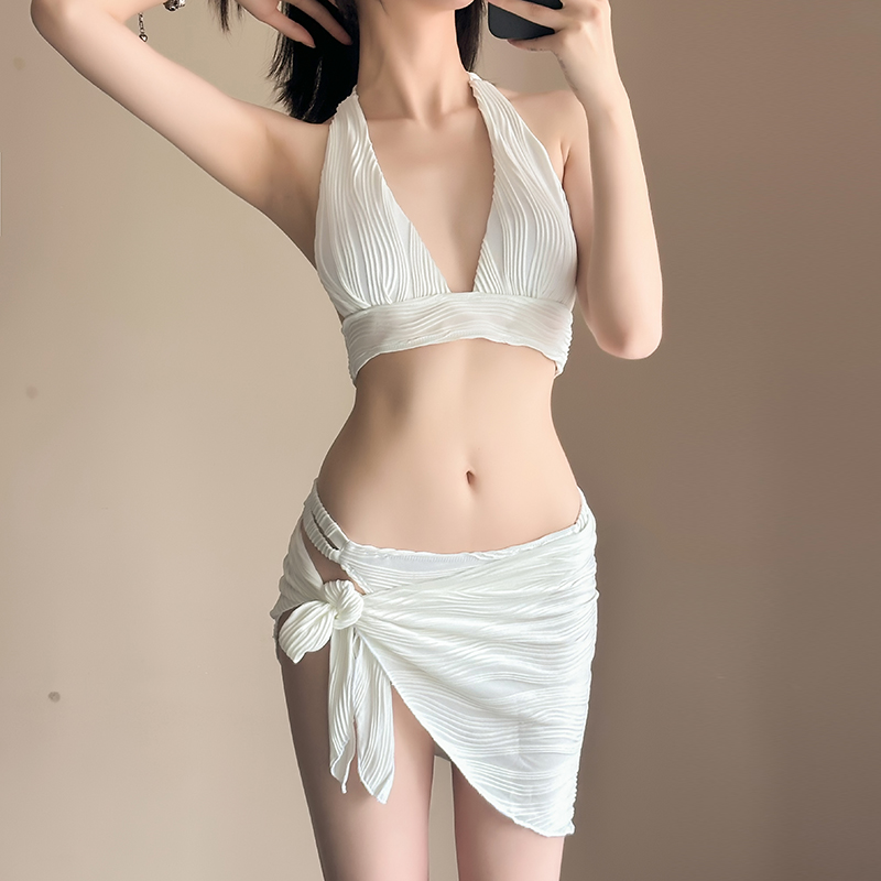 新款小香风泳衣女性感深V美背纯色时尚分体比基尼三件套小胸温泉